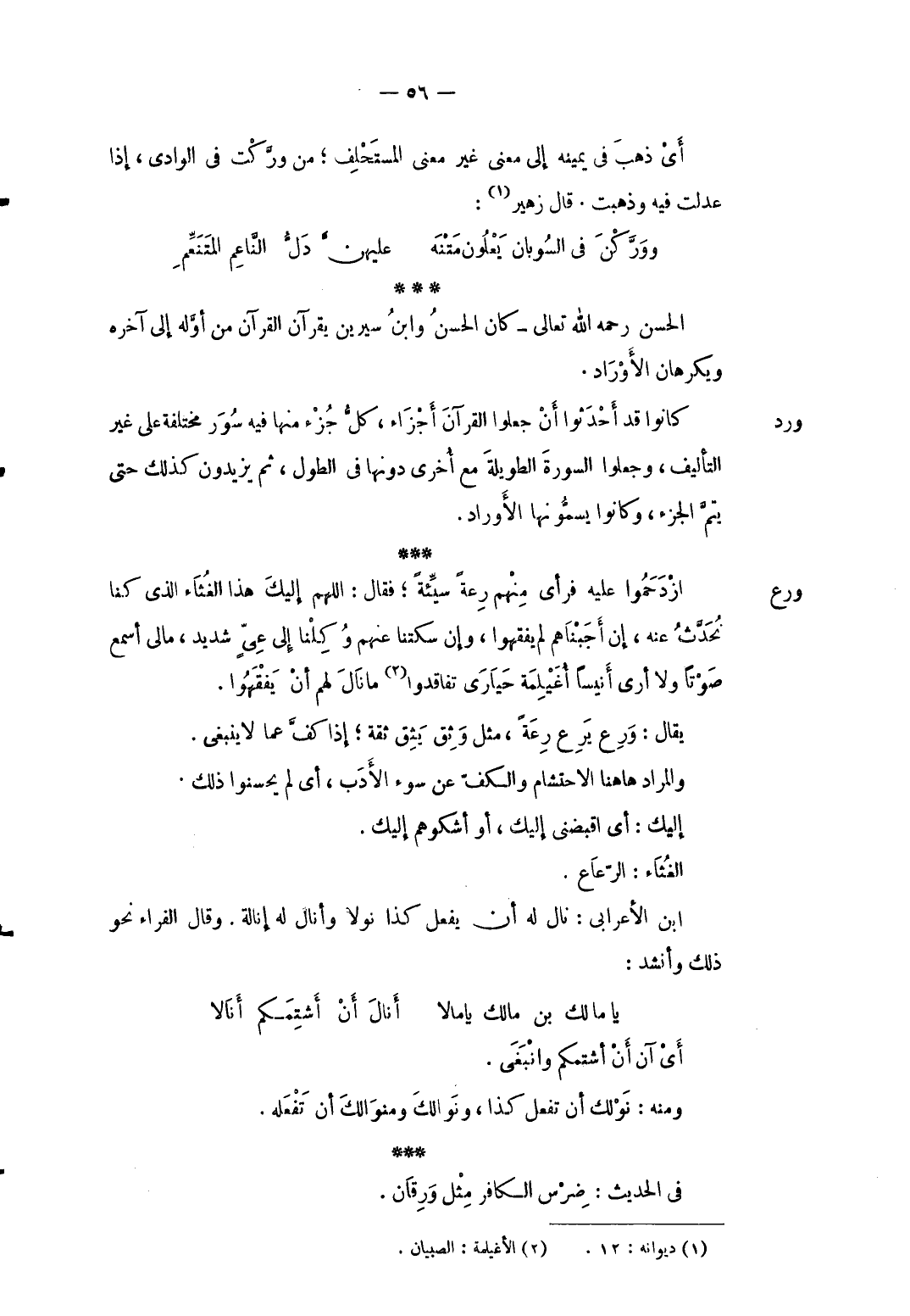 ورع ازدحموا عَلَيْهِ فَرَأى مِنْهُم رعة سَيِّئَة فَقَالَ: اللَّهُمَّ إِلَيْك هَذَا الغثاء الَّذِي كُنَّا نُحدث عَنهُ إِن أجبناهم لم يفقهوا وَإِن سكتنا عَنْهُم وكلنَا إِلَى عي شَدِيد مَالِي أسمع صَوتا وَلَا أرى أنيسا أغيلمة حيارى تفاقدوامانال لَهُم أَن بفقهوا. يُقَال: ورع يرع رعة مثل وثق يَثِق ثِقَة إِذا كفَّ عَمَّا لَا يَنْبَغِي. وَالْمرَاد هَاهُنَا الاحتشام والكف عَن سوء الْأَدَب أَي لم يحسنوا ذَلِك. إِلَيْك: أَي اقبضني إِلَيْك أَو أشكوهم إِلَيْك. الغُثاء: الرّعاع. ابْن الْأَعرَابِي: نَالَ لَهُ أَن يفعل كَذَا نولا وأنال لَهُ إنالة. وَقَالَ الْفراء نَحْو ذَلِك وَأنْشد: ... يَا مَالك بن مَالك يَا مَالا ... أَنالَ أَنْ أَشتمكم أَنَالا ... أَي آن أَن أشتمكم وانبغي. وَمِنْه نولك أَن تفعل كَذَا ونولك ومنوالك أَن تَفْعَلهُ. فِي الحَدِيث: ضرس الْكَافِر مثل ورقان.