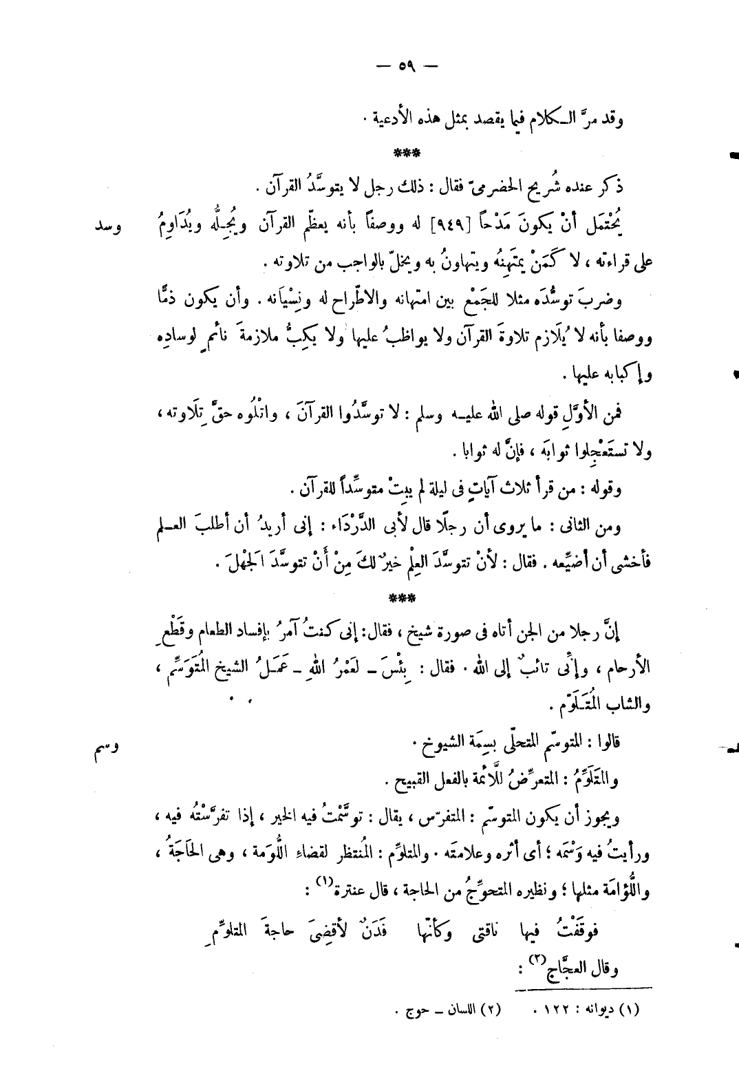 وسد ذكر عِنْده شُرَيْح الْحَضْرَمِيّ فَقَالَ: ذَلِك رجل لَا يتوسد الْقُرْآن. يُحتمل أَن يكون مدحا [949] لَهُ ووصفاً بِأَنَّهُ يعظم الْقُرْآن ويُجله ويداوم على قِرَاءَته لَا كمن يمتهنه ويتهاون بِهِ ويخل بِالْوَاجِبِ من تِلَاوَته. وَضرب توشده مثلا للْجمع بَين امتهانه والاطراح لَهُ ونسيانه. وَأَن يكون ذمًّا ووصفا بِأَنَّهُ لَا يلازم تِلَاوَة الْقُرْآن وَلَا يواظب عَلَيْهَا وَلَا يكبُّ مُلَازمَة نَائِم لوساده وإكبابه عَلَيْهَا. فَمن الأول قَوْله صلى الله عَلَيْهِ وَسلم: لَا توسَّدوا الْقُرْآن واتلوه حقَّ تِلَاوَته وَلَا تستعجلوا ثَوَابه فَإِن لَهُ ثَوابًا. وَقَوله: من قَرَأَ ثَلَاث آيَات فِي لَيْلَة لم يبت متوسداً لِلْقُرْآنِ. وَمن الثَّانِي: مَا يرْوى أَن رجلا قَالَ لأبي الدَّرْدَاء: إِنِّي أُرِيد أَن أطلب الْعلم فأخشى أَن أضيعه. فَقَالَ: لِأَن تتوسد الْعلم خيرٌ لَك من أَن تتوسد الْجَهْل.