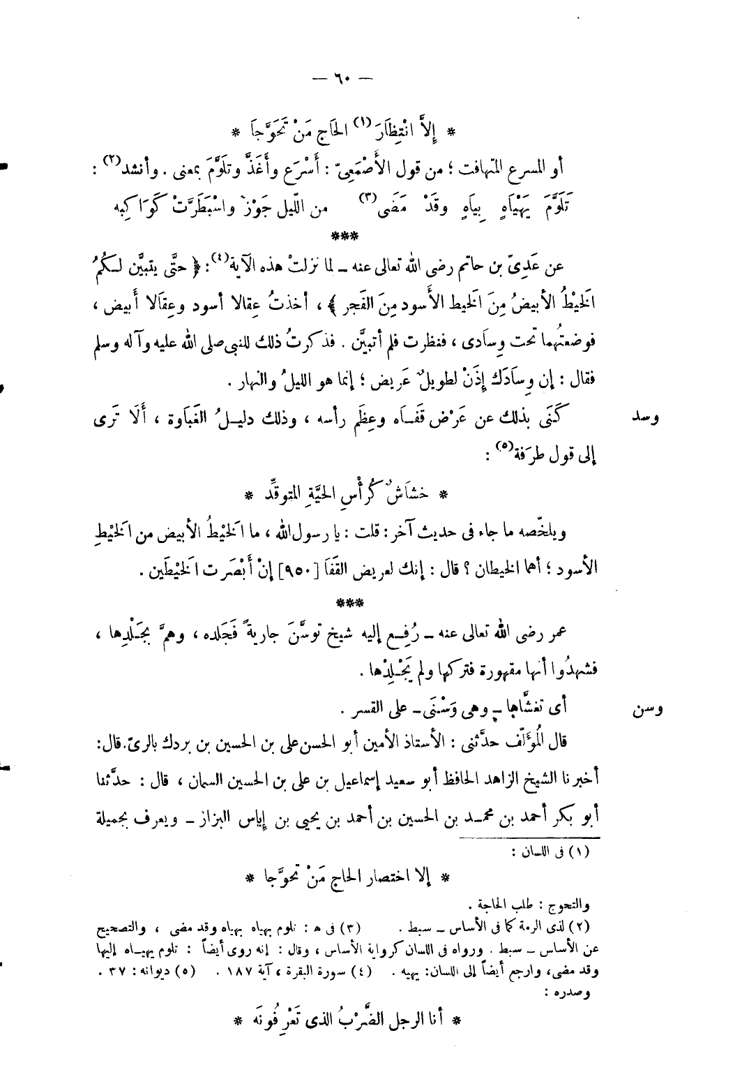 وسد عَن عدي بن حَاتِم رَضِي الله تَعَالَى لما نزلت هَذِه الْآيَة: [حتَّى يتبيَّن لكُمُ الخَيْطُ الأبيضُ مِنَ الخَيط الأَسود مِنَ الفَجر] أخذت عقَالًا أسود وَعِقَالًا أَبيض فوضعتهما تَحت وسادى فَنَظَرت فَلم أتبين. فَذكرت ذَلِك للنبى صلى الله عَلَيْهِ وَآله وَسلم فَقَالَ: إِن وِسَادك إِذن لطويل عريض إِنَّمَا هُوَ اللَّيْل وَالنَّهَار. كنى بذلك عَن عرض قَفاهُ وَعظم رَأسه وَذَلِكَ دَلِيل الغباوة أَلا ترى إِلَى قَول طرفَة. ... خشَاشٌ كُرأْسِ الحَّيةِ المتوقِّد ... ويلخصه مَا جَاءَ فِي حَدِيث آخر: قلت: يار سَوَّلَ الله مَا الْخَيط الْأَبْيَض من الْخَيط الْأسود أَهما الْخيطَان قَالَ: إِنَّك لَعَرِيض الْقَفَا [95] إِن أَبْصرت الْخَيْطَيْنِ.
