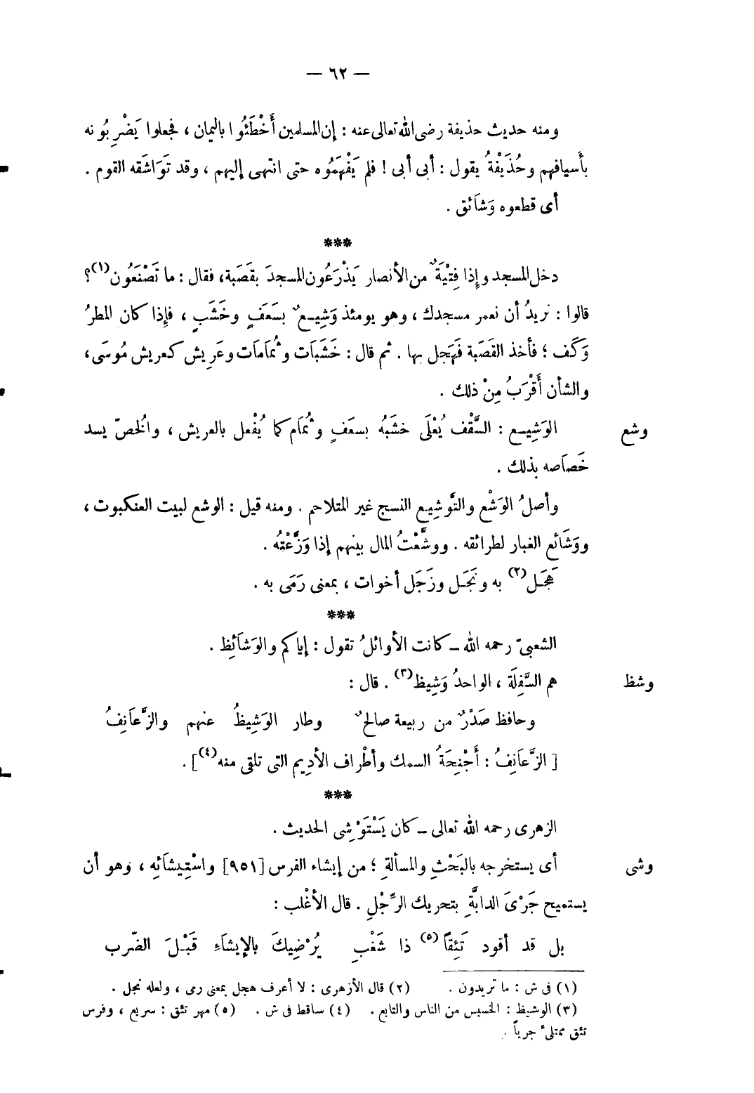 وشى الزُّهْرِيّ رَحمَه الله تَعَالَى كَانَ يستوشي الحَدِيث أَي يَسْتَخْرِجهُ بالبحث وَالْمَسْأَلَة من إيشاء الْفرس] 951 [واستيشائه وَهُوَ أَن يستميح جري الدَّابَّة بتحريك الرجل قَالَ الْأَغْلَب: ... بل قد أَقُود تَئِقاً ذَا شَغْبِ ... يُرْضِيكَ بالإيشَاءِ قَبْلَ الضّرب ...
