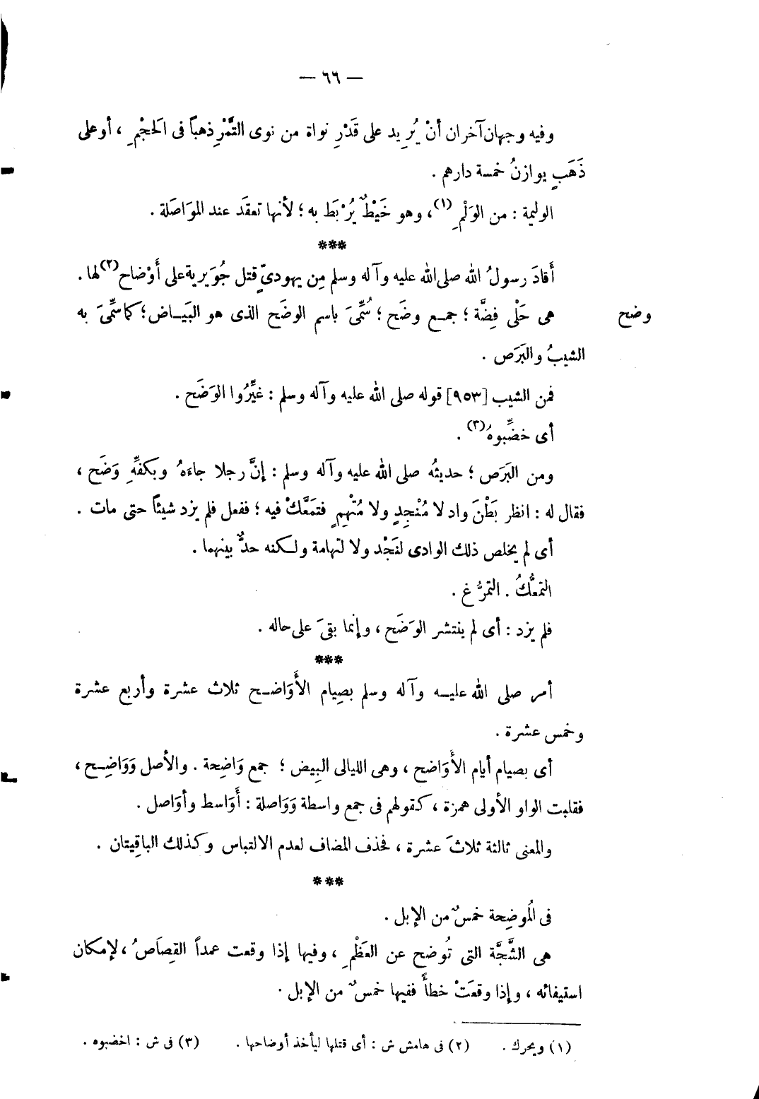 وضح أقاد رَسُول الله صلى الله عَلَيْهِ وَآله وَسلم من يهودى قتل جوَيْرِية على أوضاحلها هِيَ حلى فضَّة جمع وضح سُمي باسم الوضح الَّذِي هُوَ الْبيَاض كَمَا سمَّى بِهِ الشيب والبرص فَمن الشيب] 953 [قَوْله صلى الله عَلَيْهِ وَآله وَسلم: غيروا الوضح أَي خضبوه وَمن البرص حَدِيثه صلى الله عَلَيْهِ وَآله وَسلم: إِن رجلا جَاءَهُ وبكفِّه وضح فَقَالَ لَهُ: انْظُر بطن وَاد لَا منجدٍ وَلَا مُتَّهم فتمعك فِيهِ فَفعل فَلم يزدْ شَيْئا حَتَّى مَاتَ أَي لم يخلص ذَلِك الْوَادي لنجد وَلَا لتهامة وَلكنه حدٌّ بَينهمَا التمعُّك: التمرغ فَلم يزدْ: أَي لم ينتشر الوضح وَإِنَّمَا بَقِي على حَاله أَمر صلى الله عَلَيْهِ وَآله وَسلم بصيام الأواضح ثَلَاث عشرَة وَأَرْبع عشرَة وَخمْس عشرَة أَي بصيام أَيَّام الأواضح وَهِي اللَّيَالِي الْبيض جمع وَاضِحَة وَالْأَصْل وواضح فقلبت الْوَاو الأولى همزَة كَقَوْلِهِم فِي جمع وَاسِطَة وواصلة: أواسط وأواصل وَالْمعْنَى ثَالِثَة ثَلَاث عشرَة فَحذف الْمُضَاف لعدم الالتباس وَكَذَلِكَ الباقيتان فِي الْمُوَضّحَة خمس من الْإِبِل هِيَ الشَّجَّة الَّتِي توضح عَن الْعظم وفيهَا إِذا وَقعت عمدا الْقصاص لِإِمْكَان اسْتِيفَائه وَإِذا وَقعت خطأ فَفِيهَا خمس من الْإِبِل