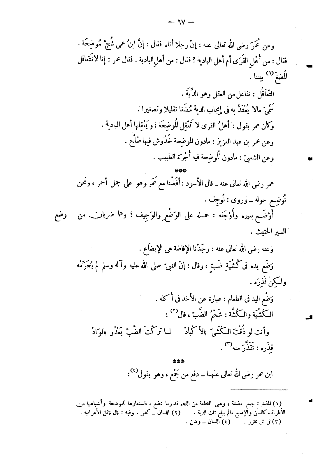 وضع عمر رَضِي الله تَعَالَى عَنهُ قَالَ الْأسود: أفضنا مَعَ عمر وَهُوَ على جمل أَحْمَر وَنحن نوضع حوله وروى: نوجف أوضع بعيره وأوجفه: حمله على الْوَضع والوجيف وهما ضَرْبَان من السّير الحثيث وَعنهُ رَضِي الله تَعَالَى عَنهُ: وجدنَا الْإِفَاضَة هِيَ الإيضاع وضع يَده فِي كشية ضبٍّ وَقَالَ: إِن النَّبِي صلى الله عَلَيْهِ وَآله وَسلم لم يُحرمه وَلَكِن قذره وضع الْيَد فِي الطَّعَام: عبارَة عَن الْأَخْذ فِي أكله الكشية والكشَّة: شَحم الضَّبّ قَالَ: ... وَأَنت لَو ذُقْتَ الكُشَيَ بالأكْبَادْ ... لما تركْتَ الضَّبَّ يَعْدُو بالوَادْ ... قذره: تقذر مِنْهُ