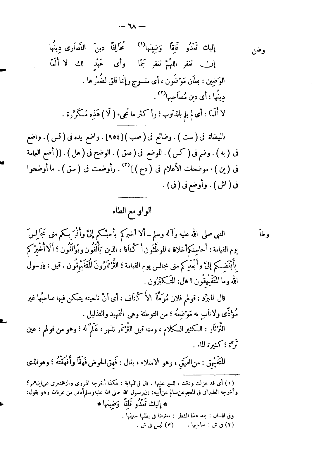 وطأ النَّبِي صلى الله عَلَيْهِ وَآله وَسلم أَلا أخْبركُم بأحبكم إِلَى وأقربكم مني مجَالِس يَوْم الْقِيَامَة: أحاسنكم أَخْلَاقًا الموطئون أكنافا الَّذين يألفون ويؤلفون أَلا أخْبركُم بأبغضكم إِلَى وأبعدكم مني مجَالِس يَوْم الْقِيَامَة الثرثارون والمتفيهقون قيل: يَا رَسُول الله وَمَا المتفيهقون قَالَ: المتكبرون قَالَ الْمبرد: قَوْلهم فلَان موطأ الأكناف أَي أَن ناحيته يتَمَكَّن فِيهَا صَاحبهَا غير مؤذًي وَلَا نَاب بِهِ مَوْضِعه من التوطئه وَهِي التَّمْهِيد والتذليل الثرثار: الْكثير الْكَلَام وَمِنْه قيل الثرثار للنهر علم لَهُ وَهُوَ من قَوْلهم: عين ثرة كَثِيرَة المَاء. المتفيهق: من الفهق وَهُوَ الامتلاء يُقَال: فهق الْحَوْض فهقاً وأفهقته وَهُوَ الَّذِي