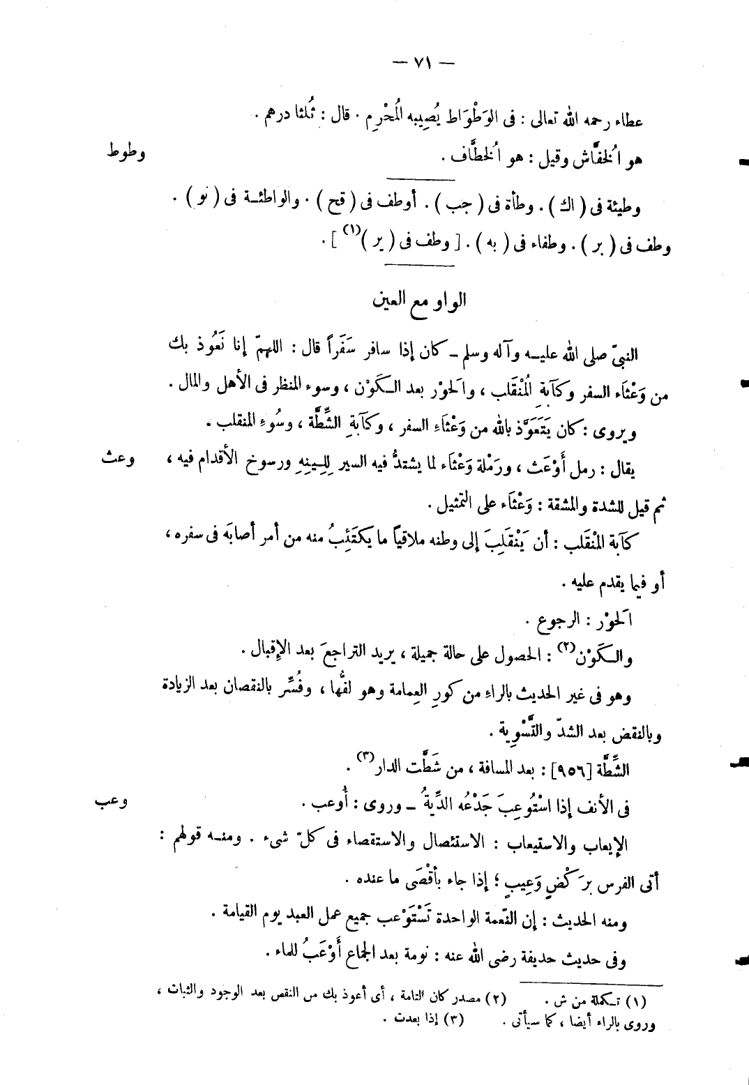 وعث النَّبِي صلى الله عَلَيْهِ وَآله وَسلم كَانَ إِذا سَافر سفرا قَالَ: اللَّهُمَّ إِنَّا نَعُوذ بك من وعثاء السّفر وكآبة المنقلب والحور بعد الْكَوْن وَسُوء المنظر فِي الْأَهْل وَالْمَال ويروى: كَانَ يتَعَوَّذ بِاللَّه من وعثاء السّفر وكآبة الشِّطة وَسُوء المنقلب يُقَال: رمل أوعث ورملة وعثاء لما يشْتَد فِيهِ السّير للينه ورسوخ الْأَقْدَام فِيهِ ثمَّ قيل للشدة وَالْمَشَقَّة: وعثاء على التَّمْثِيل كآبة المنقلب: أَن يَنْقَلِب إِلَى وَطنه ملاقياً مَا يكتئب مِنْهُ من أَمر أَصَابَهُ فِي سَفَره أَو فِيمَا يقدم عَلَيْهِ الْحور: الرُّجُوع والكون: الْحُصُول على حَالَة جميلَة يُرِيد التراجع بعد الإقبال وَهُوَ فِي غير الحَدِيث بالراء من كور الْعِمَامَة وَهُوَ لفُّها وفُسِّر بِالنُّقْصَانِ بعد الزِّيَادَة وبالنقض بعد الشدّ والتَّسوية الشِّطَّة] 956 [: بعد الْمسَافَة من شطت الدَّار
