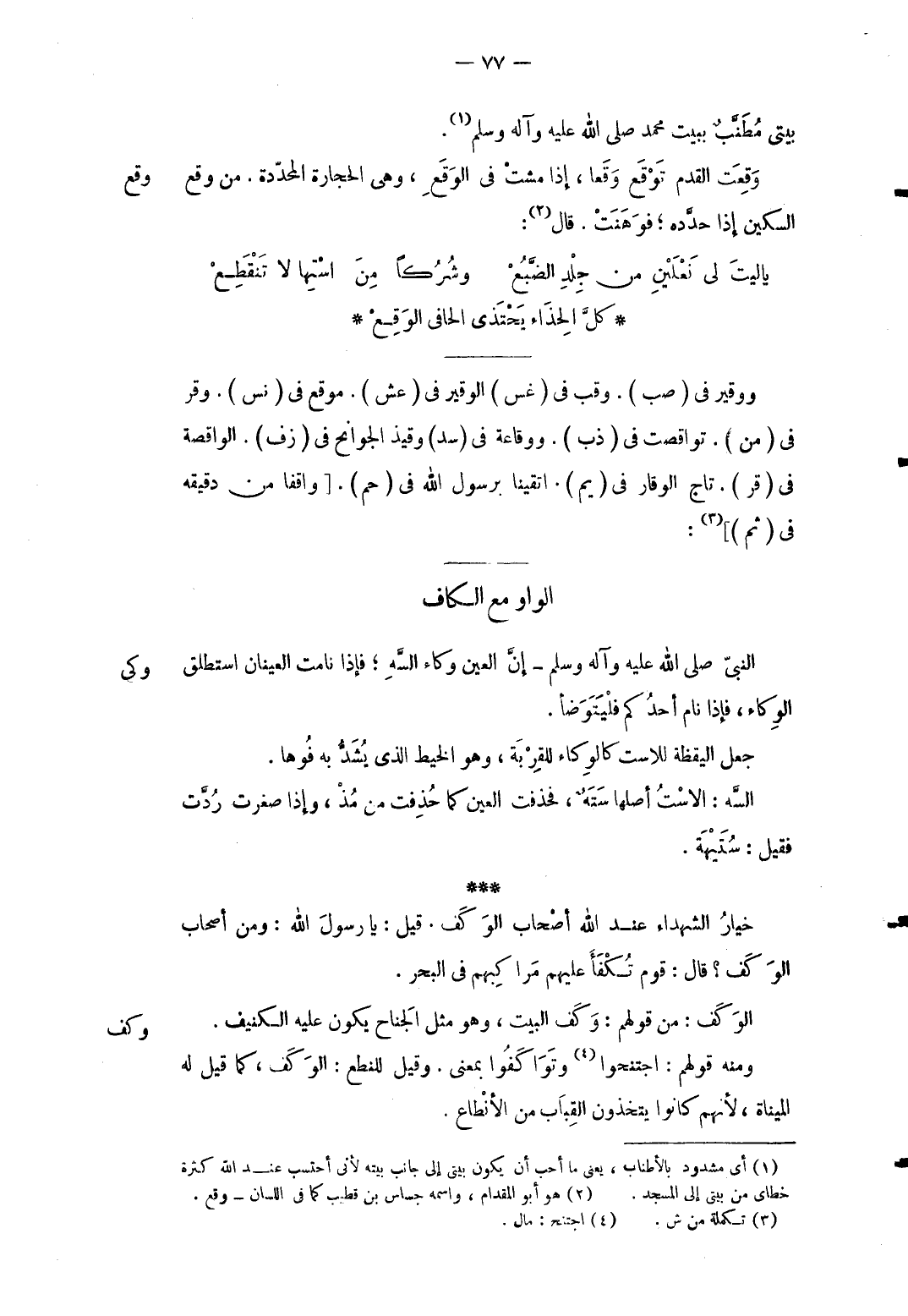 بَيْتِي مُطنَّب بِبَيْت مُحَمَّد صلى الله عَلَيْهِ وَآله وَسلم وَقعت الْقدَم توقع وَقعا إِذا مشت فِي الوقع وَهِي الْحِجَارَة المحددة من وَقع السكين إِذا حدده فوهنت قَالَ: ... يَا ليتَ لي نَعْلَيْنِ من جِلْدِ الضَّبُعْ ... وشُرُكاً منَ اسْتِها لَا تَنْقَطِعْ