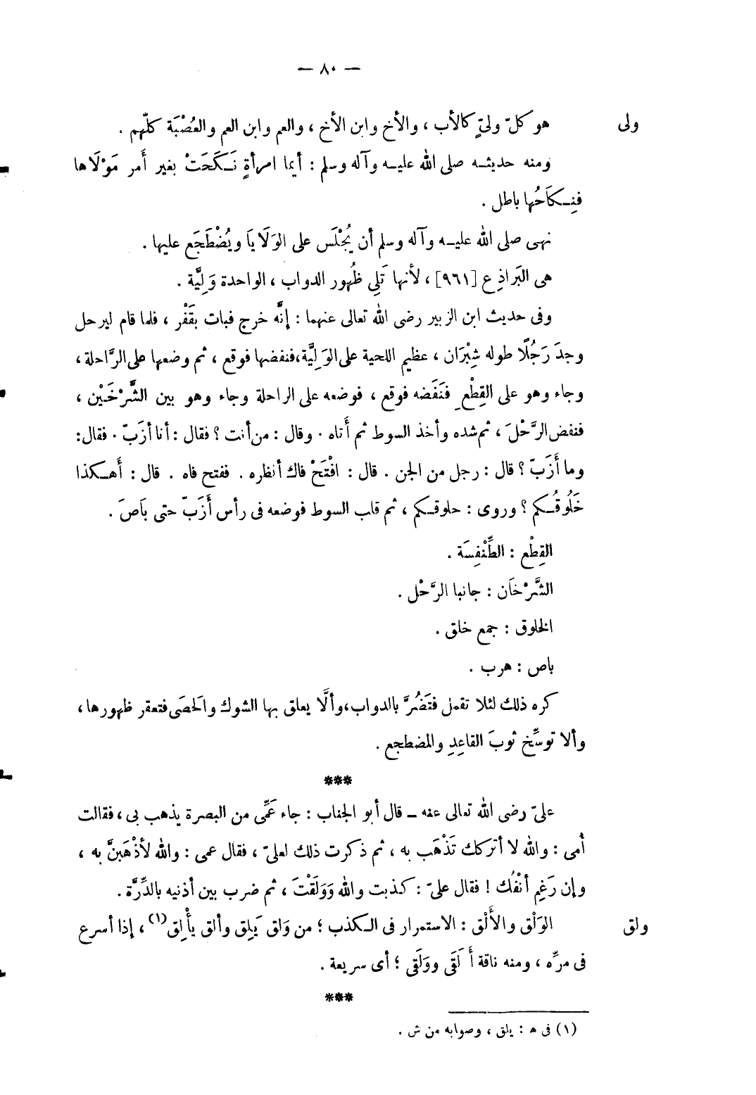 هُوَ كل ولي كَالْأَبِ وَالْأَخ وَابْن الْأَخ وَالْعم وَابْن الْعم والعصبة كلهم وَمِنْه حَدِيثه صلى الله عَلَيْهِ وَآله وَسلم: أَيّمَا امْرَأَة نكحت بِغَيْر أَمر مَوْلَاهَا فنكاحها بَاطِل نهى صلى الله عَلَيْهِ وَآله وَسلم أَن يجلس على الولايا ويضطجع عَلَيْهَا هِيَ البراذع] 961 [لِأَنَّهَا تلى ظُهُور الدَّوَابّ الْوَاحِدَة ولية وَفِي حَدِيث ابْن الزبير رَضِي الله تَعَالَى عَنْهُمَا: أَنه خرج فَبَاتَ بقفر فَلَمَّا قَامَ ليرحل وجد رجلا طوله شبران عَظِيم اللِّحْيَة على الولَّية فنفضها فَوَقع ثمَّ وَضعهَا على الرَّاحِلَة وَجَاء وَهُوَ على الْقطع فنفضه فَوَقع فَوَضعه على الرَّاحِلَة وَجَاء وَهُوَ بَين الشرخين فنفض الرحل ثمَّ شده وَأخذ السَّوْط ثمَّ أَتَاهُ وَقَالَ: من أَنْت فَقَالَ: أَنا أزب فَقَالَ: وَمَا أزب قَالَ: رجل من الْجِنّ قَالَ: افْتَحْ فَاك أنظرهُ فَفتح فَاه قَالَ: أهكذا خلوقكم وروى: حلوقكم ثمَّ قلب السَّوْط فَوَضعه فَوق رَأس أزب حَتَّى باص الْقطع: الطنفسة الشرخان: جانبا الرحل الخلوق: جمع خلق باص: هرب كره ذَلِك لِئَلَّا تقمل فتضر بالدواب وَألا يعلق بهَا الشوك والحصى فتعقر ظُهُورهَا وَألا توسخ ثوب الْقَاعِد والمضطجع