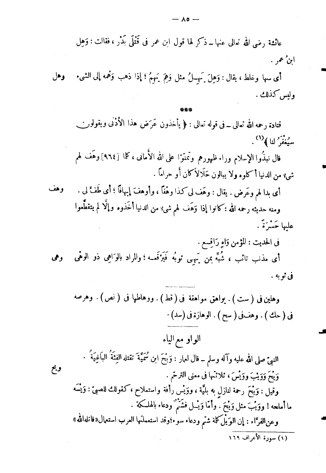 وهف قَتَادَة رَحمَه الله تَعَالَى فِي قَوْله تَعَالَى: (يَأْخُذُونَ عَرَض هَذَا الأدْنى وَيَقُولُونَ سيُغْفَرُ لنا) قَالَ نبذوا الْإِسْلَام وَرَاء ظُهُورهمْ وتمنوا على الله الْأَمَانِي كلما [964] وهف لَهُم شَيْء من الدُّنْيَا أكلوه وَلَا يبالون حَلَالا كَانَ أَو حَرَامًا أَي بدالهم وَعرض يُقَال: وهف لي كَذَا وهفاً وأوهف إيهافاً أَي طف لي وَمِنْه حَدِيثه رَحْمَة الله: كَانُوا إِذا وهف لَهُم شَيْء من الدُّنْيَا أَخَذُوهُ وَإِلَّا لم يتقطعوا عَلَيْهَا حسرة فِي الحَدِيث: الْمُؤمن واه راقع أَي مذنب تائب شبه بِمن يهى ثَوْبه فيرقعه وَالْمرَاد بالواهي ذُو الوهى فِي ثَوْبه