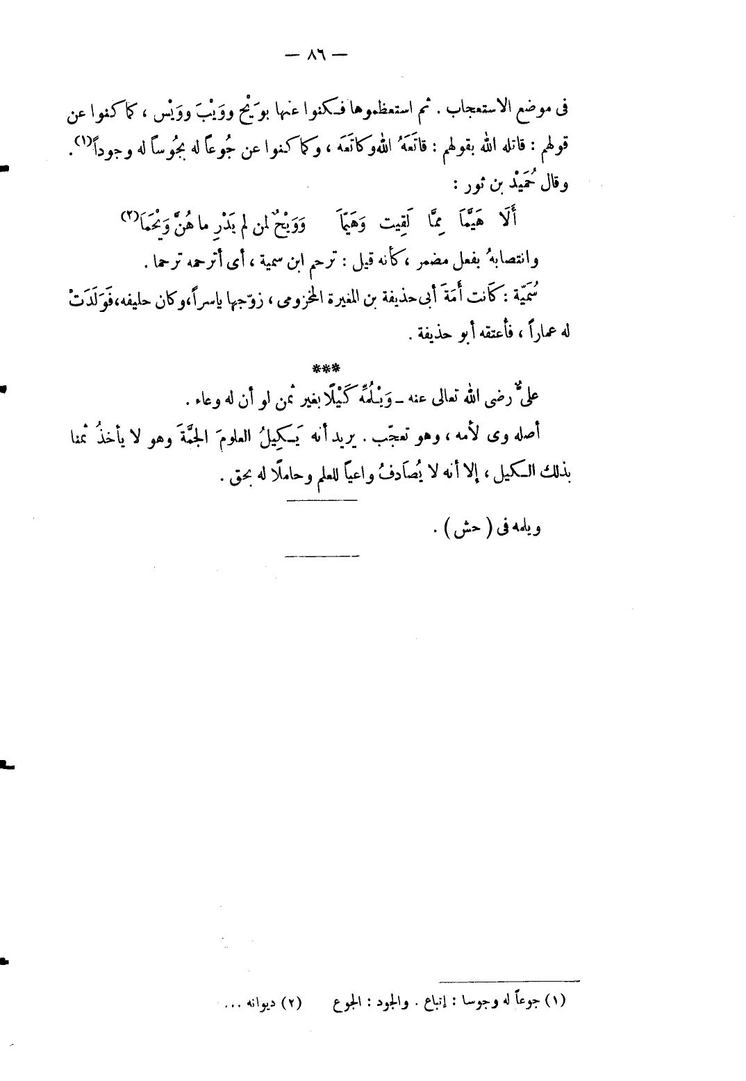 فِي مَوضِع الاستعجاب. ثمَّ استعظموها فكنوا عَنْهَا بويح وويب وويس كَمَا كنوا عَن قَوْلهم: قَاتله الله بقَوْلهمْ: قاتعه الله وكاتعه وكما كنواعن جوعا لَهُ بجوسا لَهُ وجوداوقال حميد بن ثَوْر: ... أَلاَ هَيَّمَا مِمَّا لَقِيت وَهَيّماً ... وَوَيْحٌ لمن لم يَدْرِ مَا هُنَّ وَيْحَمَا ... وانتصابه بِفعل مُضْمر كَأَنَّهُ قيل: ترحم ابْن سميَّة أَي أترحمه ترحما. سميَّة: كَانَت أمة أبي حُذَيْفَة بن الْمُغيرَة المَخْزُومِي زوّجها ياسراً وَكَانَ حليفه فَولدت لَهُ عماراً فَأعْتقهُ أَبُو حُذَيْفَة. عَليّ رَضِي الله تَعَالَى عَنهُ ويلمِّه كَيْلا بِغَيْر ثمن لَو أَن لَهُ وعَاء. أَصله وي لأمه وَهُوَ تعجب. يُرِيد أَنه يَكِيل الْعُلُوم الجمَّة وَهُوَ لَا يَأْخُذ ثمنا بذلك الْكَيْل إِلَّا أَنه لَا يُصَادف واعيا للْعلم وحاملا لَهُ بِحَق.
