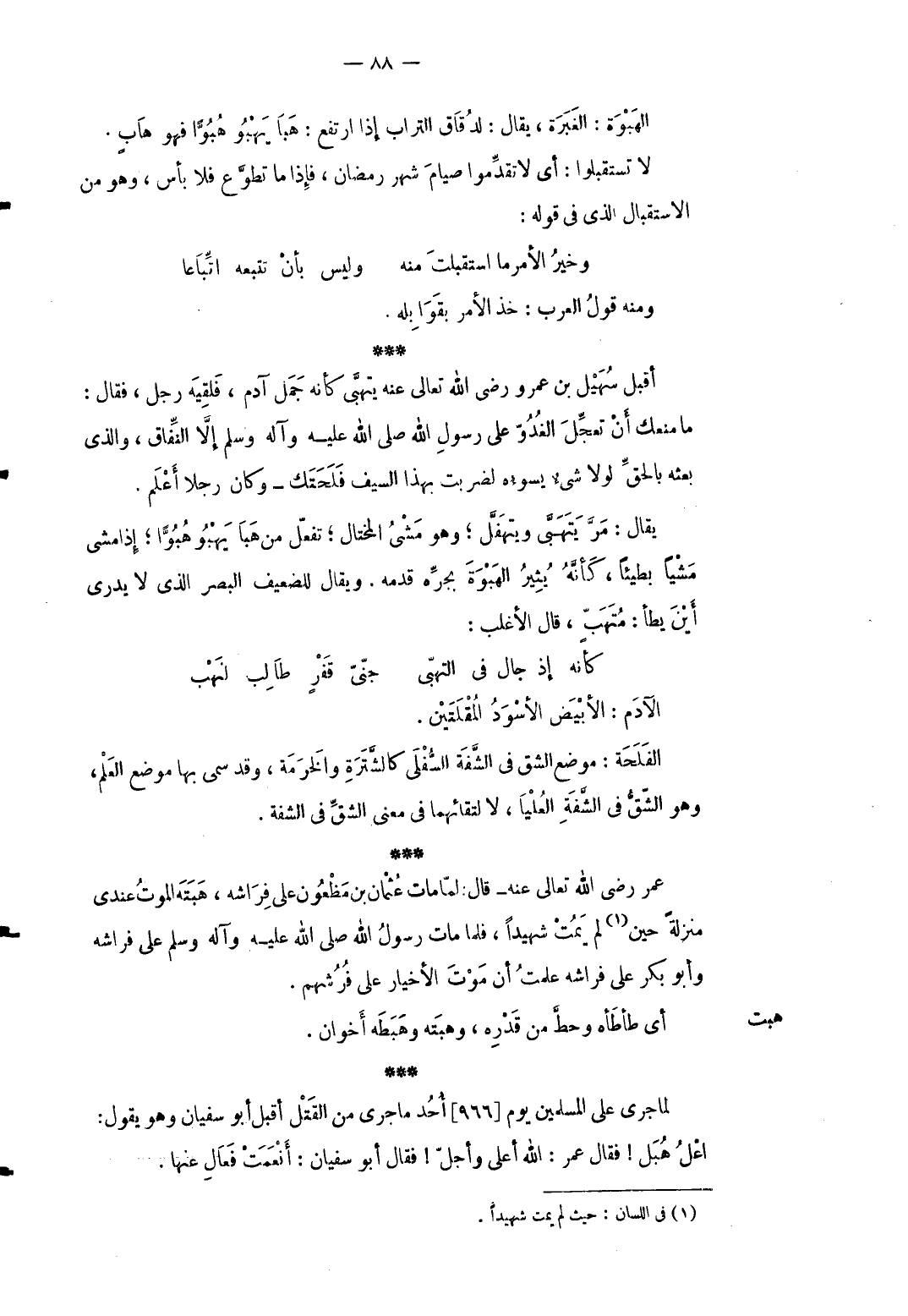 الهبوة: الغبرة يُقَال: لدقاق التُّرَاب إِذا ارْتَفع: هبا يهبو هبوا فَهُوَ هاب. لَا تستقبلوا: أى لَا تقدمُوا صِيَام شهر رَمَضَان فَإِذا مَا تطوَّع فَلَا بَأْس وَهُوَ من الِاسْتِقْبَال الَّذِي فِي قَوْله: ... وخيرُ الْأَمر مَا استقبلتَ مِنْهُ ... وَلَيْسَ بأنْ تتبعه اتِّبَاعا ... وَمِنْه قَول الْعَرَب: خُذ الْأَمر بقوا بله. أقبل سُهَيْل بن عَمْرو رَضِي الله تَعَالَى عَنهُ يتهبى كَأَنَّهُ جمل آدم فَلَقِيَهُ رجل فَقَالَ: مَا مَنعك أَن تعجِّل الغدوّ على رَسُول الله صلى الله عَلَيْهِ وَآله وَسلم إِلَّا النِّفَاق والذى بَعثه بِالْحَقِّ لَوْلَا شئ يسوءه لضَرَبْت بِهَذَا السَّيْف فلحتك وَكَانَ رجلا أعلم. يُقَال: مر يتهبى ويتهفل وَهُوَ مَشى المختال تفعل من هبا يهبو هبوًّا إِذا مَشى مشياً بطيئاً كَأَنَّهُ يثير الهبوة بجرَّه قدمه. وَيُقَال للضعيف الْبَصَر الَّذِي لَا يدْرِي أَيْن يطَأ متهب قَالَ الْأَغْلَب: ... كَأَنَّهُ إِذْ جال فِي التهبّي ... جنّىّ قَفْرٍ طَالِب لنَهْب ... الآدم: الْأَبْيَض الْأسود المقلتين. الفلحة: مَوضِع الشق فِي الشّفة السُّفْلى كالشترة والخرمة وَقد سمى بهَا مَوضِع الْعلم وَهُوَ الشق فى الشّفة الْعليا لَا لتقائهما فى معنى الشق فى الشّفة.