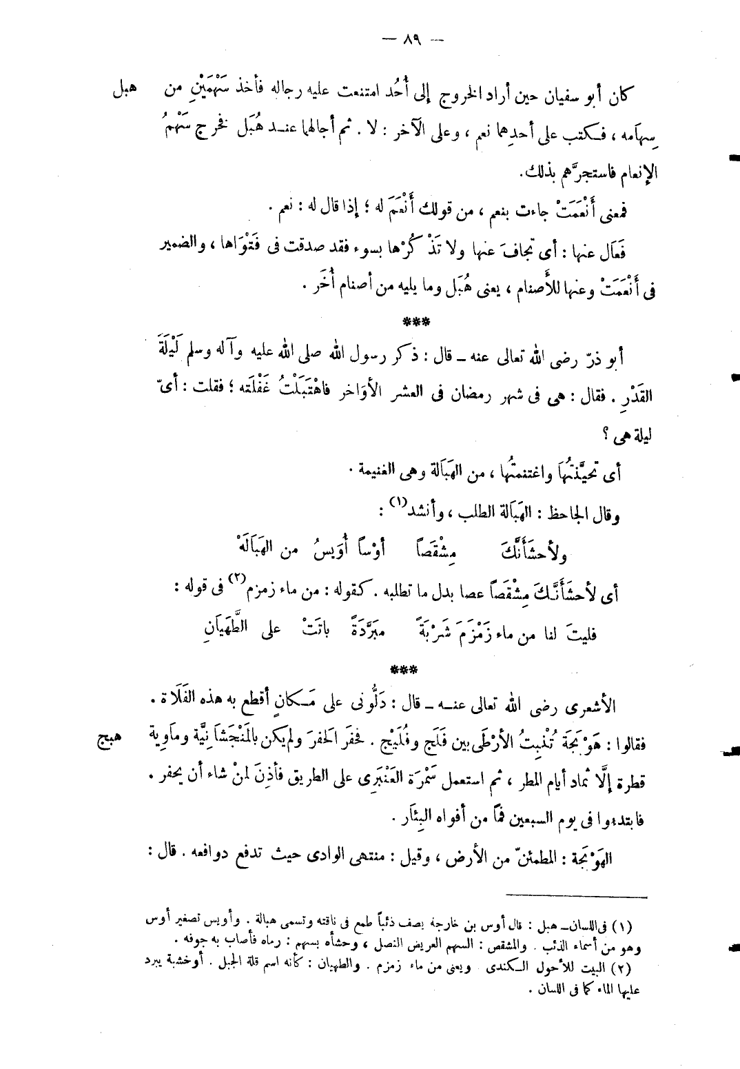 هُبل كَانَ أَبُو سُفْيَان حِين أَرَادَ الْخُرُوج إِلَى أُحد امْتنعت عَلَيْهِ رِجَاله فَأخذ سَهْمَيْنِ من سهامه فَكتب على أَحدهمَا نعم وعَلى الآخر: لَا. ثمَّ أجالهما عِنْد هُبل فَخرج سهم الإنعام فاستجرَّهم بذلك. فَمَعْنَى أَنْعَمت جَاءَت بنعم من قَوْلك أنعم لَهُ إِذا قَالَ لَهُ: نعم. فعال عَنْهَا: أَي تجاف عَنْهَا وَلَا تذكرها بِسوء فقد صدقت فِي فتواها وَالضَّمِير فِي أَنْعَمت وعنها للأصنام يَعْنِي هُبل وَمَا يَلِيهِ من أصنام أُخر. أَبُو ذَر رَضِي الله تَعَالَى عَنهُ قَالَ ذكر رَسُول الله صلى الله عَلَيْهِ وَآله وَسلم لَيْلَة الْقدر. فَقَالَ: هِيَ فِي شهر رَمَضَان فِي الْعشْر الْأَوَاخِر فاهتبلت غفلته فَقلت: أيّ لَيْلَة هِيَ أَي تحينتها واغتنمتها من الهبالة وَهِي الْغَنِيمَة. وَقَالَ الجاحظ: الهبالة الطّلب وَأنْشد: ... ولأحشَأَنَّكَ مِشْقَصاً ... أوْساً أُوَيسُ من الهَبَالَهْ ... أَي لأحشأنك مشقصاً عَصا بدل مَا تطلبه. كَقَوْلِه: من مَاء زَمْزَم. فِي قَوْله: ... فليتَ لنا من مَاء زَمْزَم شربة ... مبردة باتت على الطهيان ...