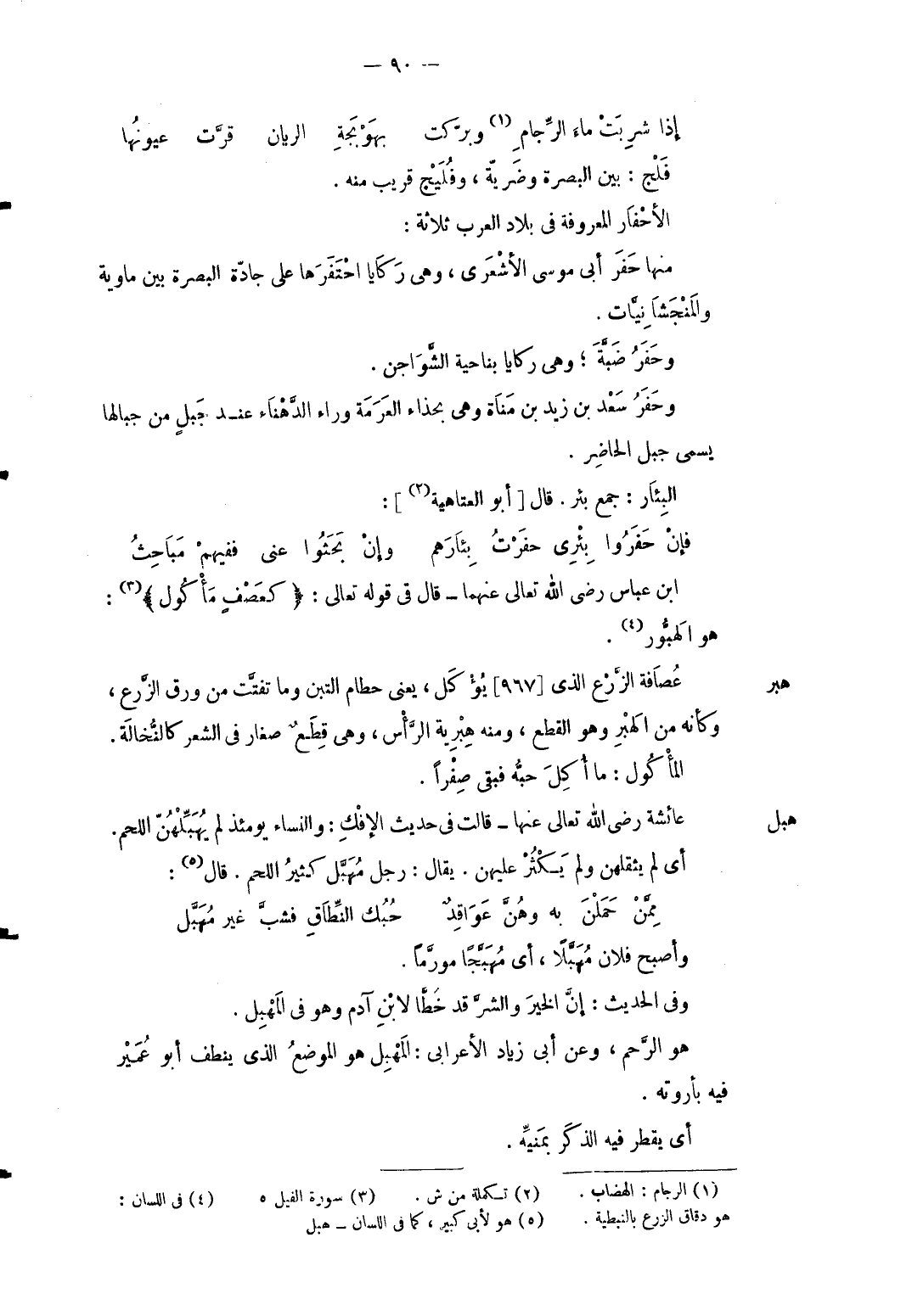 .. إِذا شربت مَاء الرجاموبركت ... بهوبجة الريان قرت عبونها ... فلج: بَين الْبَصْرَة وضربة وفليج قريب مِنْهُ. الأحفار الْمَعْرُوفَة فِي بِلَاد الْعَرَب ثَلَاثَة: مِنْهَا حفر أبي مُوسَى الْأَشْعَرِيّ وَهِي ركايا احتفرها على جادّة الْبَصْرَة بَين ماوية والمنجشانيَّات. وحفر ضبَّة وَهِي ركايا بِنَاحِيَة الشواجن. وحفر سعد بن زيد بن مَنَاة وَهِي بحذاء العرمة وَرَاء الدَّهناء عِنْد جبل من جبالها يُسمى جبل الْحَاضِر. البئار: دمع بِئْر قَالَ [أَبُو الْعَتَاهِيَة] : ... فإنْ حَفَرُوا بِئْرِي حفَرْتُ بِئَارَهم ... وإنْ بَحَثُوا عني ففيهمْ مَبَاحِثُ ... ابْن عَبَّاس رَضِي الله تَعَالَى عَنْهُمَا قَالَ قَوْله تَعَالَى (كعصف مَأْكُول) : هُوَ الهبور.