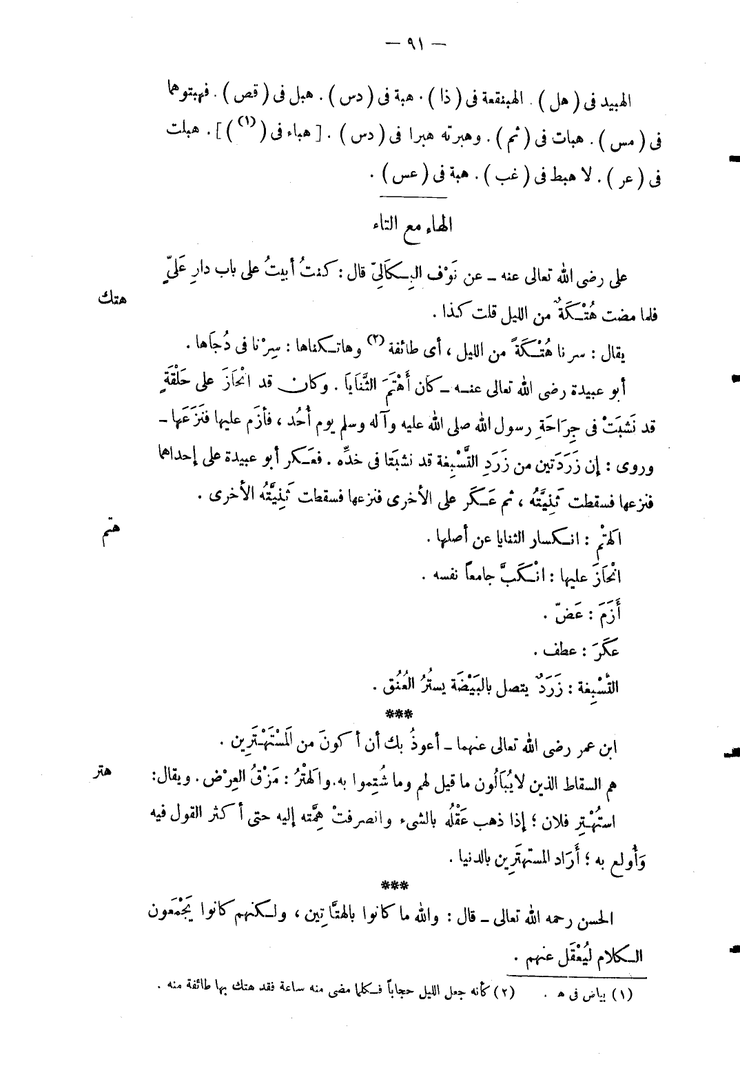 هتك عَليّ رَضِي الله تَعَالَى عَنهُ عَن نوف الْبكالِي قَالَ: كنت أَبيت على بَاب دَار عليٍ فَلَمَّا مَضَت هتكة من اللَّيْل قلت كَذَا. يُقَال: سرنا هتكة من اللَّيْل أَي طَائِفَة وهاتكناها: سرنا فِي دجاها. أَبُو عُبَيْدَة رَضِي الله تَعَالَى عَنهُ كَانَ أهتم الثنايا. وَكَانَ قد انحاز على حَلقَة قد نشبت فِي جِرَاحَة رَسُول الله صلى الله عَلَيْهِ وَآله وَسلم يَوْم أُحد فأزم عَلَيْهَا فنزعها وروى: إِن زردتين من زرد التسبغة قد نشبتا فِي خَدّه. فعكر أَبُو عُبَيْدَة على إِحْدَاهمَا فنزعها فَسَقَطت ثنيته ثمَّ عَسْكَر على الْأُخْرَى فنزعها فَسَقَطت ثنيته الْأُخْرَى.