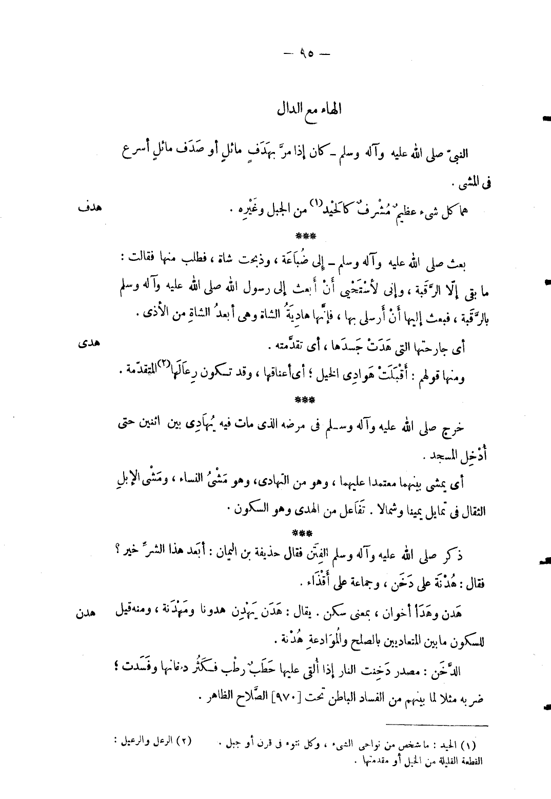 هدى بعث صلى الله عَلَيْهِ وَآله وَسلم إِلَى ضباعة وذبحت شَاة فَطلب مِنْهَا فَقَالَت: مَا بقى إِلَّا الرَّقَبَة وَإِنِّي لأستحى أَن أبْعث إِلَى سَوَّلَ الله صلى الله عَلَيْهِ وَآله وَسلم بِالرَّقَبَةِ فَبعث إِلَيْهَا أَن أرسلى بهَا فَإِنَّهَا هادية الشَّاة وَهِي أبعد الشَّاة من الْأَذَى. أَي جارحتها الَّتِي هدت جَسدهَا أَي تقدمته. وَمِنْهَا قَوْلهم: أَقبلت هوادى الْخَيل أَي أعناقها وَقد تكون رعالها الْمُتَقَدّمَة. خرج صلى الله عَلَيْهِ وَآله وَسلم فِي مَرضه الَّذِي مَاتَ فِيهِ يُهادي بَين اثْنَيْنِ حَتَّى أُدخل الْمَسْجِد. أَي يمشي بَينهمَا مُعْتَمدًا عَلَيْهِمَا وَهُوَ من التهادي وَهُوَ مشي النِّسَاء ومشي الْإِبِل الثقال فِي تمايل يَمِينا وَشمَالًا. تفَاعل من الْهدى وَهُوَ السّكُون.