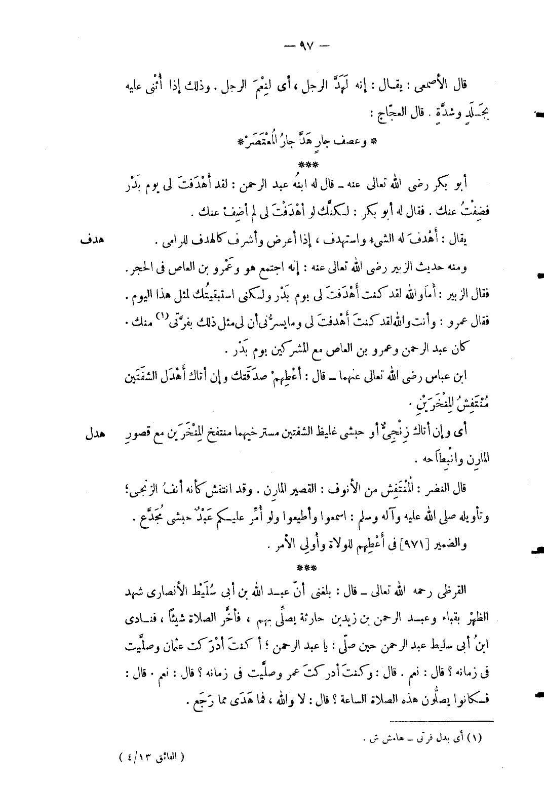قَالَ الْأَصْمَعِي: يُقَال: إِنَّه لهد الرجل أَي لنعم الرجل. وَذَلِكَ إِذا أثنى عَلَيْهِ يجلد وَشدَّة. قَالَ العجاج: ... وعصف جارٍ هَدَّ جارُ المتعصر ... أَبُو بكر رَضِي الله تَعَالَى عَنهُ قَالَ لَهُ ابْنه عبد الرَّحْمَن: لقد أهدفت لي يَوْم بدر فضفت عَنهُ. فَقَالَ لَهُ أَبُو بكر: لكنك لَو أهدفت لي لم أضف عَنْك. يُقَال: أهدف لَهُ الشئ واستهدف إِذا أعرض وأشرف كالهدف للرامي. وَمِنْه حَدِيث الزبير رَضِي الله تَعَالَى عَنهُ: إِنَّه اجْتمع هُوَ وَعَمْرو بن الْعَاصِ فِي الْحجر. فَقَالَ الزبير: أما وَالله لقد كنت أهدفت لي يَوْم بدر وَلَكِنِّي استبقيتك لمثل هَذَا الْيَوْم. فَقَالَ عَمْرو: وَأَنت وَالله لقد كنت أهدفت لي وَمَا يسرني أَن لي مثل ذَلِك بفرتي مِنْك. كَانَ عبد الرَّحْمَن وَعَمْرو بن الْعَاصِ مَعَ الْمُشْركين يَوْم بدر. ابْن عَبَّاس رَضِي الله تَعَالَى عَنْهُمَا قَالَ: أعطهم صدقتك وَإِن أَتَاك أهدل الشفتين منتفش المنخرين.