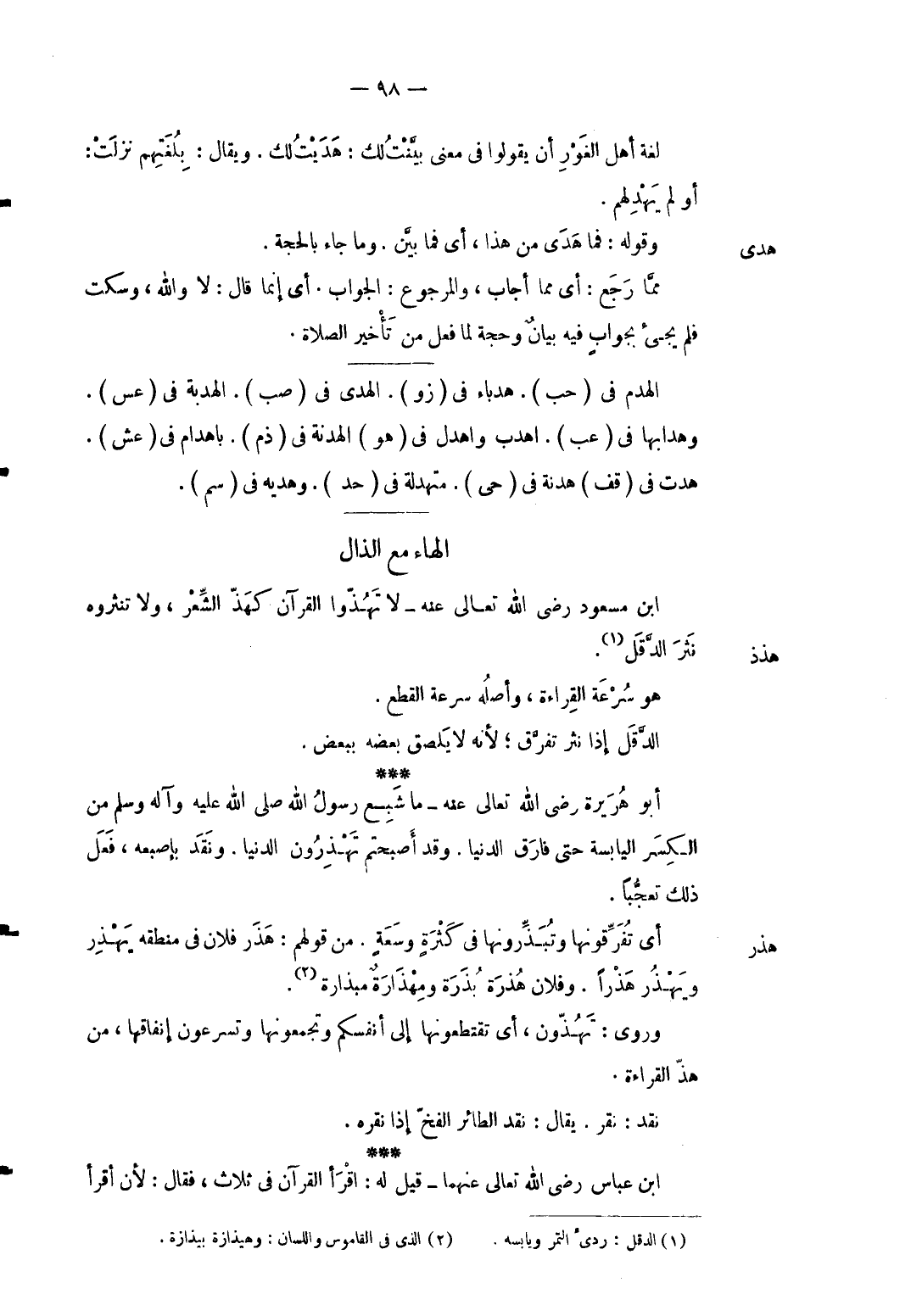 هذر أَبُو هُرَيْرَة رَضِي الله تَعَالَى عَنهُ مَا شبع رَسُول الله صلى الله عَلَيْهِ وَآله وَسلم من الْكسر الْيَابِسَة حَتَّى فَارق الدُّنْيَا. وَقد أَصْبَحْتُم تهذرون الدُّنْيَا. وَنقد بإصبعه فعل ذَلِك تَعَجبا. أَي تفرقونها وتبذرونها فِي كَثْرَة وسعة. من قَوْلهم: هذر فلَان فِي مَنْطِقه يهذر ويهذر هذرا. وَفُلَان هذرة بذرة ومهذارة مبذارة. وروى: تهذون أى تقتطعونها إِلَى أَنفسكُم وتجمعونها وتسرعون إنفاقها من هَذ الْقِرَاءَة. نقد: نقر. يُقَال نقد الفخّ إِذا نقره. ابْن عَبَّاس رَضِي الله تَعَالَى عَنْهُمَا قيل لَهُ: اقْرَأ الْقُرْآن فِي ثَلَاث فَقَالَ: لِأَن أَقرَأ