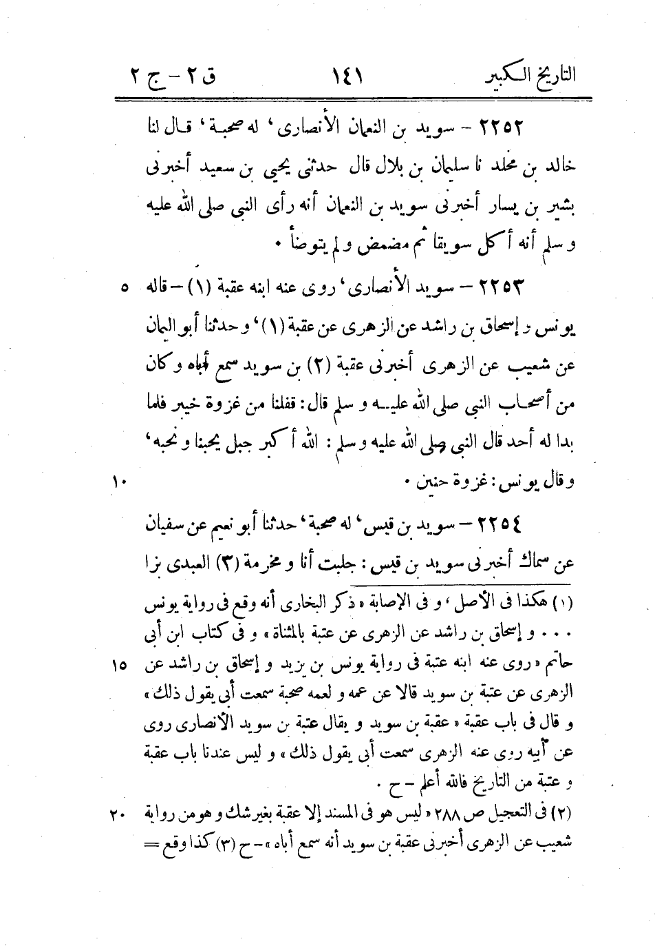 (1) راجع ترجمة حنظلة بن سويد رقم 157 وحنظلة بن خويلد رقم 162 والتعليق عليهما - ح (2) راجع ترجمة سعد بن شراح رقم (1952) - ح (3) أخشى أن يكون هذا هو سويد بن عبيد العجلي الاتي رقم (2277) فاني لم أجد غيره والله أعلم - ح (4) زاد ابن أبي حاتم " ابن أخي سماك بن حرب " (5) لم أجد سويدا هذا في غير هذا الكتاب - ح (6) كتب عليه في الاصل " صح ".