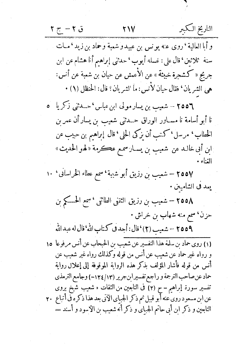 2574 - شعيب بْن خالد الرازي (5) ، عن عطاء وحنظلة ابن سبرة وأيوب، روى عَنْهُ عَمْرو بْن أَبِي قيس وَيَحْيَى بْن العلاء، هو البجلي، وَقَالَ لنا علي عَنْ سُفْيَان: كَانَ شعيب خال (6) يَحْيَى بْن العلاء حفظ من الزُّهْرِيّ ومات شابا، أرى هذا هو صاحب حجاج بْن دينار