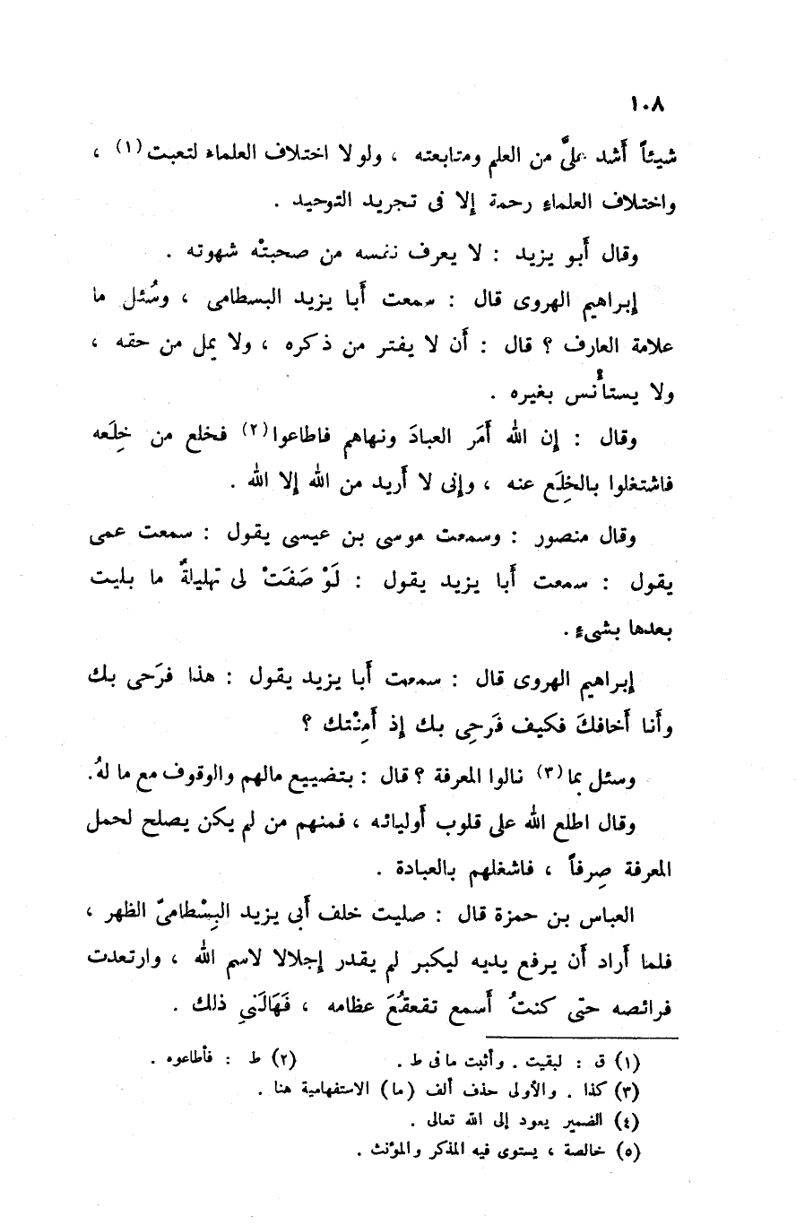 إبراهيم الهروي قال سمعت أبا يزيد البسطامي وسئل ما علامة العارف قال ان لا يفتر من ذكره ولا يمل من حقه ولا يستأنس بغيره