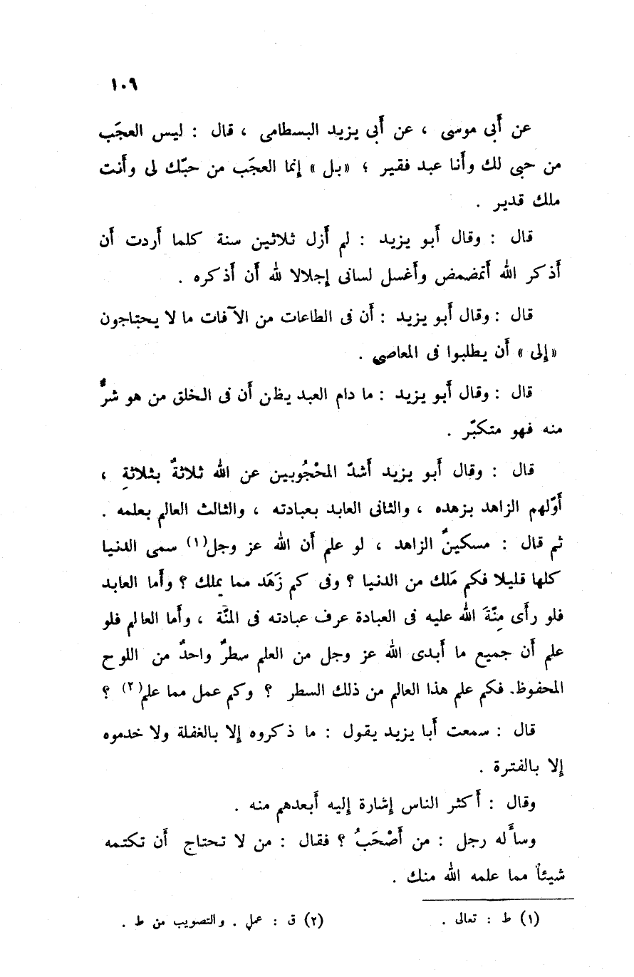 عن أبي موسى عن أبي يزيد البسطامي قال ليس العجب من حبي لك وأنا عبد فقير بل إنما العجب من حبك لي وأنت ملك قدير