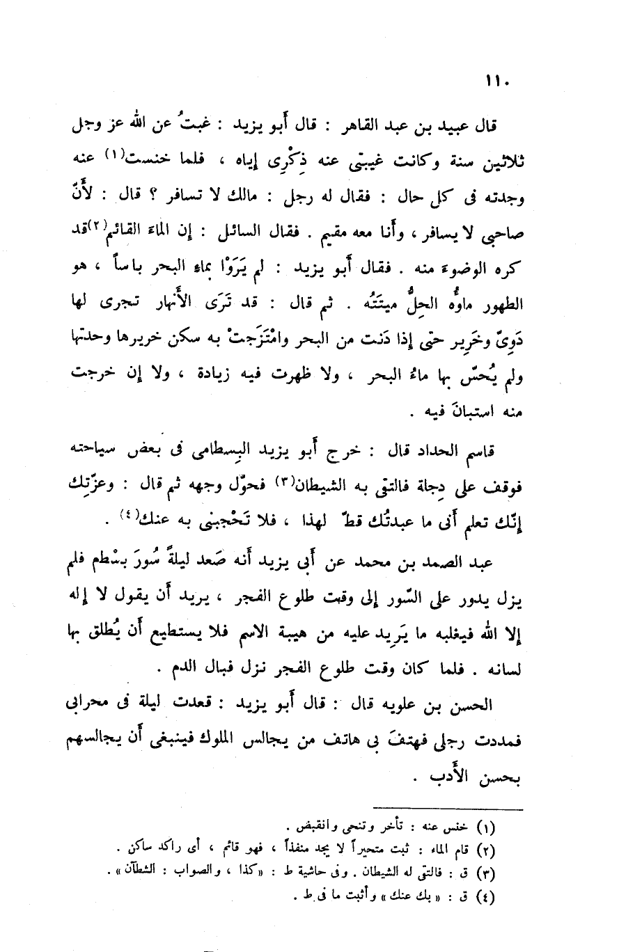 عبد الصمد بن محمد عن أبي يزيد انه صعد ليلة سور بسطم فلم يزل يدور على السور إلى وقت طلوع الفجر يريد أن يقول لا إله إلا الله فيغلبه ما يريد عليه من هيبة الاسم فلا يستطيع أن يطلق بها لسانه فلما كان وقت طلوع الفجر نزل فبال الدم