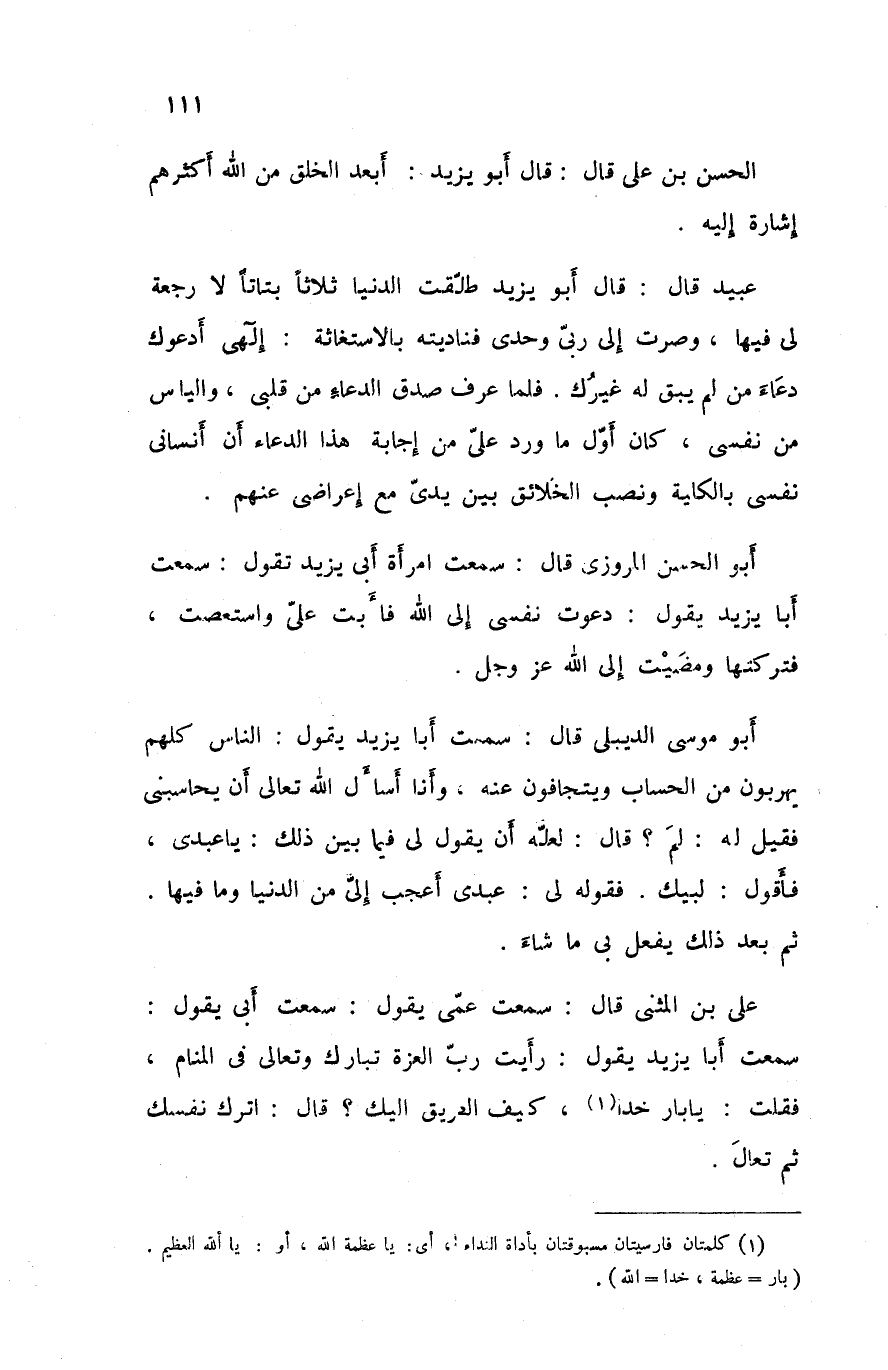 أبو الحسن المروزي قال سمعت امرأة أبي يزيد تقول سمعت أبا يزيد يقول دعوت نفسي إلى الله فأبت علي واستعصت فتركتها ومضيت إلى الله عزوجل