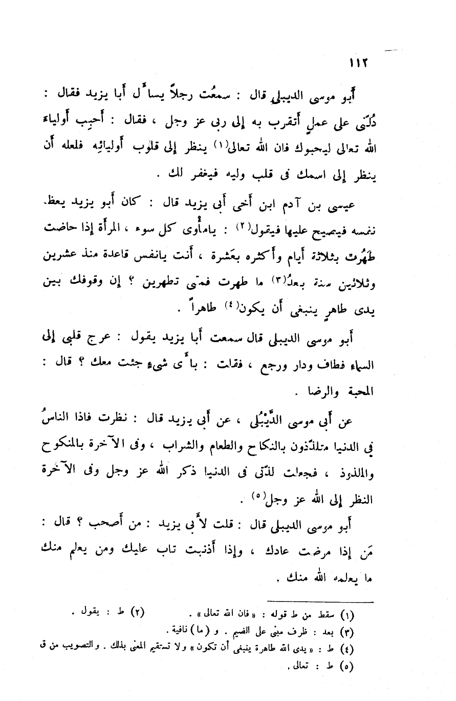 ابو موسى الديبلي قال سمعت أبا يزيد يقول عرج قلبي إلى السماء فطاف ودار ورجع فقلت بأي شيء جئت معك قال المحبة والرضا