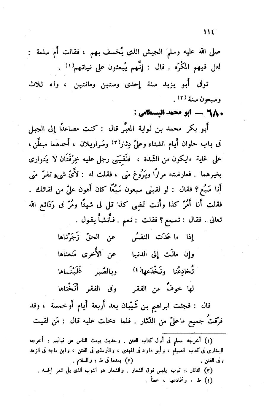 أبو بكر محمد بن ثوابة المعبر قال كنت مصاعدا إلى الجبل في باب حلوان أيام الشتاء وعلي دثار وسراويلان أحدهما مبطن على غاية ما يكون من الشدة فلقيني رجل عليه خرقتان لا يتوارى بغيرهما فعارضته مرارا ويروغ مني فقلت له لأي شيء تفر مني انا سبع فقال لو لقيني سبعون سبعا كان أهون علي من لقائك فقلت انا أمر كذا وأنت تمضي كذا قل لي شيئا ومر في ودائع الله تعالى فقال تسمع فقلت نعم فأنشأ يقول