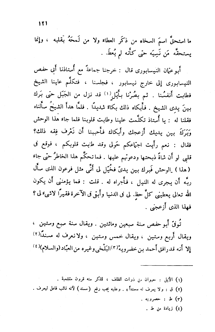 أبو عثمان النيسابوري قال خرجنا جماعة مع أستاذنا أبي حفص النيسابوري إلى خارج نيسابور فجلسنا فتكلم علينا الشيخ فطابت أنفسنا ثم بصرنا بأيل قد نزل من الجبل حتى برك بين يدي الشيخ فأبكاه ذلك بكاء شديدا فلما هدأ الشيخ سألناه فقلنا له يا أستاذ تكلمت علينا وطابت قلوبنا فلما جاء هذا الوحش وبرك بين يديك أزعجك وأبكاك فأحببنا أن نعرف فقه ذلك فقال نعم رأيت اجتماعكم حولي و قد طابت قلوبكم فوقع في قلبي لو أن شاة ذبحتها و دعوتهم عليها فما تحكم هذا الخاطر حتى جاء هذا الوحش فبرك بين يدي فخيل لي أني مثل فرعون الذي سأل ربه أن يجري له النيل فأجراه له قلت فما يؤمنني أن يكون الله تعالى يعطيني كل حظ لي في الدنيا وأبقى في الآخرة فقيرا لا شيء لي فهذا الذي أزعجني