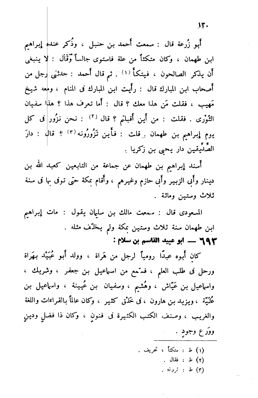 المسعودي قال سمعت مالك بن سليمان يقول مات إبراهيم ابن طهمان سنة ثلاث و ستين بمكة و لم يخلف مثله