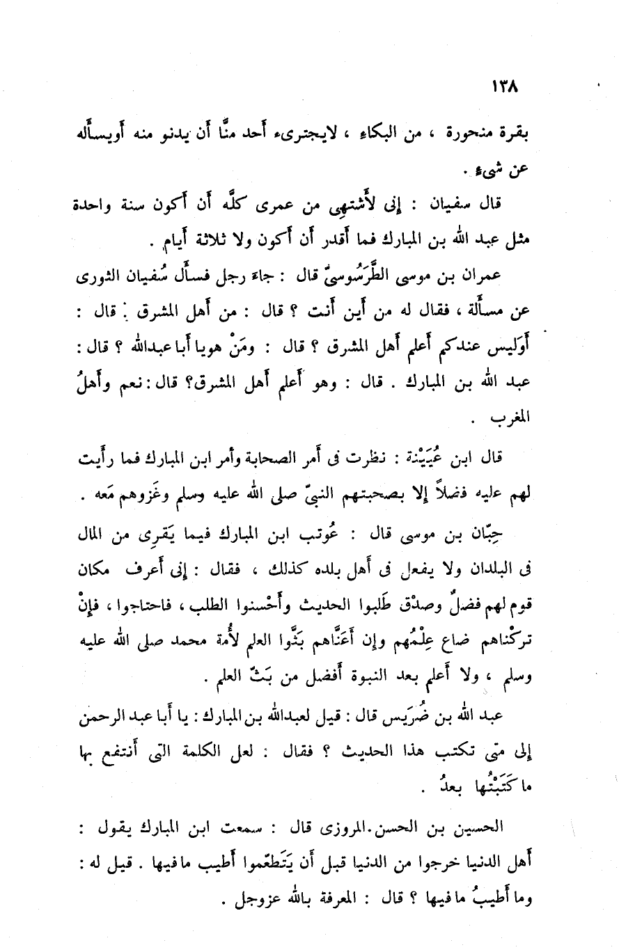 عبد الله بن ضريس قال قيل لعبد الله بن المبارك يا أبا عبد الرحمن إلى متى تكتب هذا الحديث فقال لعل الكلمة التي أنتفع بها ما كتبتها بعد