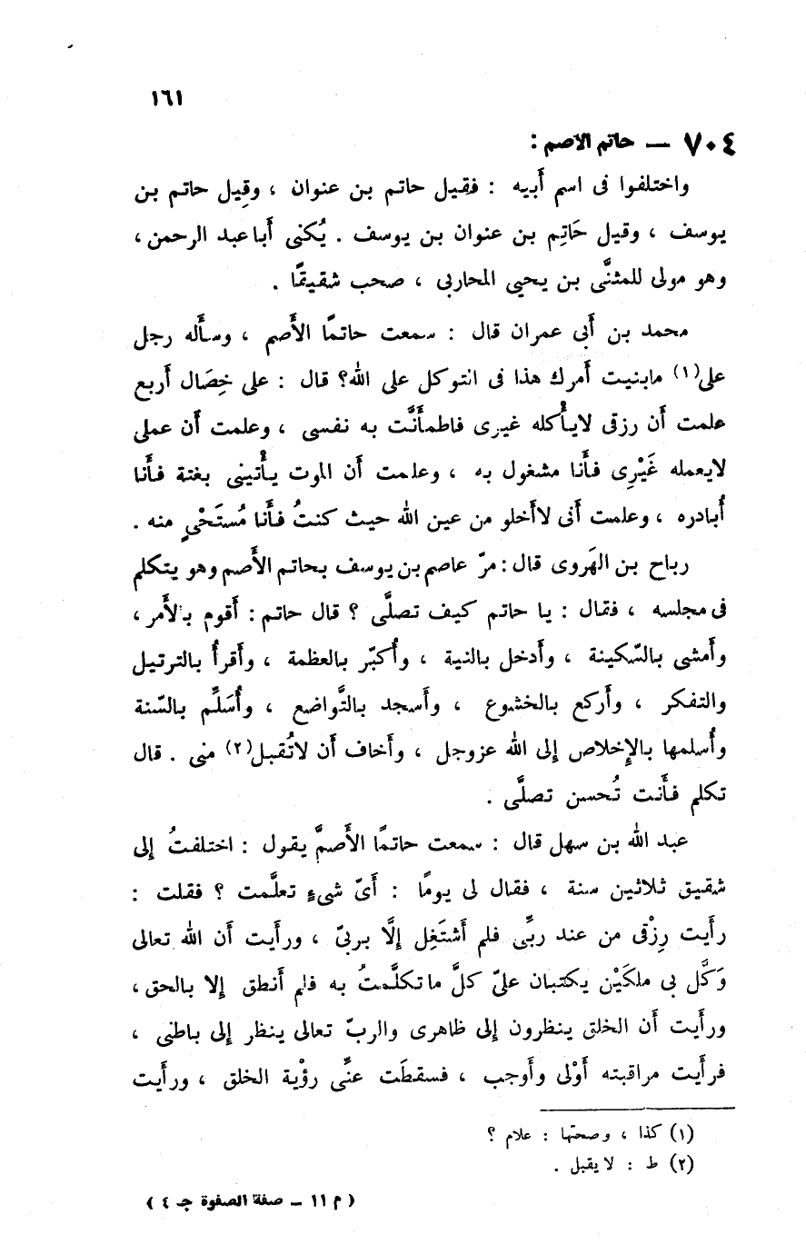 محمد بن أبى عمران قال سمعت حاتما الأصم وسأله رجل على ما بنيت أمرك هذا فى التوكل على الله قال على خصال أربع علمت أن رزقى لا يأكله غيرى فاطمأنت به نفسى وعلمت أن عملى لايعمله غيرى فأنا مشغول به وعلمت أن الموت يأتينى بغته فأنا أبادره وعلمت أنى لاأخلو من عين الله حيث كنت فأنا مستحى منه