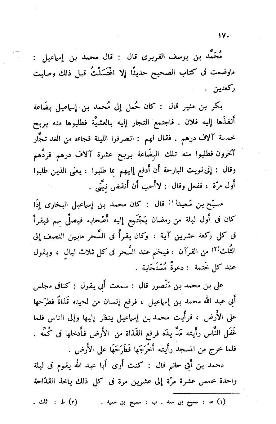 مسبح بن سعيد قال كان محمد بن إسماعيل البخاري إذا كان في أول ليلة من رمضان يجتمع إليه أصحابه فيصلي بهم فيقرأ في كل ركعة عشرين آية و كان يقرأ في السحر ما بين النصف إلى الثلث من القرآن فيختم عند السحر في كل ثلاث ليال و يقول عند كل ختمة دعوة مستجابة