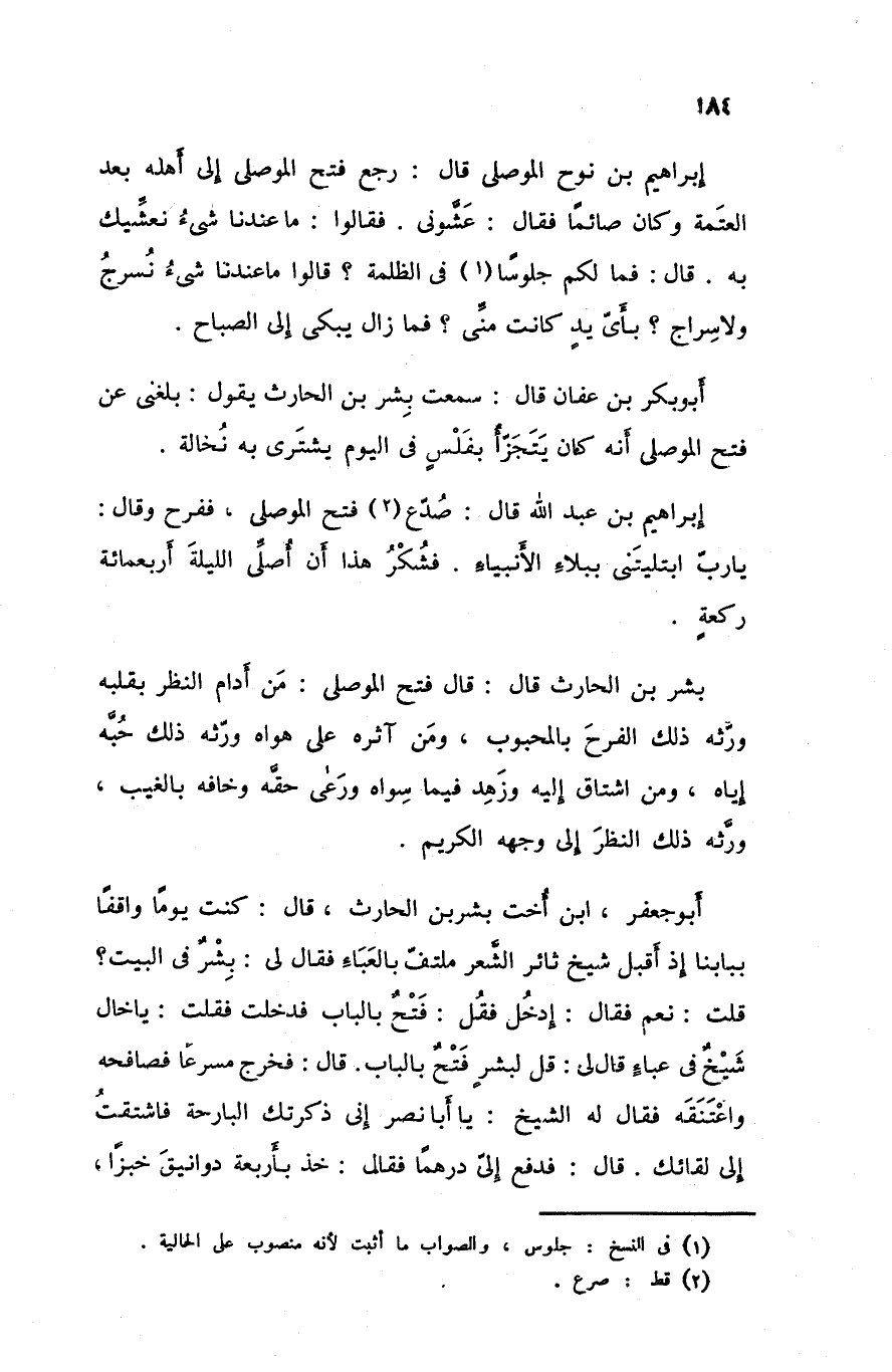 أبو بكر بن عفان قال سمعت بشر بن الحارث يقول بلغني عن فتح الموصلي أنه كان يتجزأ بفلس في اليوم يشتري به نخالة