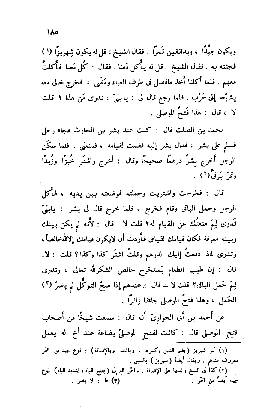 و يكون جيدا و بدانقين تمرا فقال الشيخ قل له يكون شهريزا فجئته به فقال الشيخ قل له يأكل معنا فقال كل معنا فأكلت معهم فلما أكلنا أخذ ما فضل في طرف العباء و مضى فخرج خالي معه يشيعه إلى حرب فلما رجع قال لي يا بني تدري من هذا قلت لاقال هذا فتح الموصلي