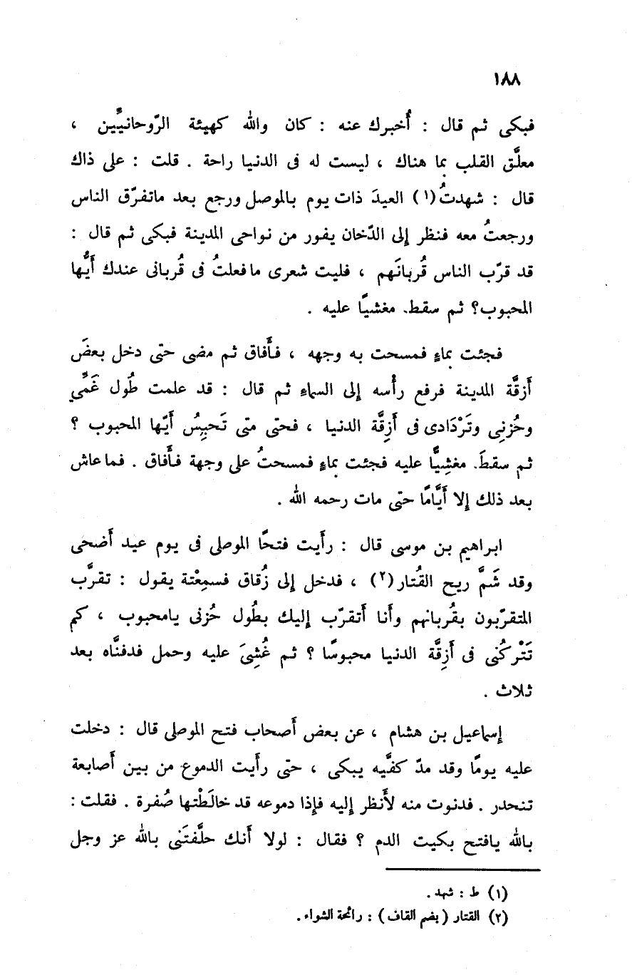 فبكى ثم قال أخبرك عنهكان و الله كهيئة الروحانيين معلق القلب بما هناك ليست له في الدنيا راحة قلتعلى ذاك قال شهدت العيد ذات يوم بالموصل و رجع بعد ما تفرق الناس و رجعت معه فنظر إلى الدخان يغور من نواحي المدينة فبكى ثم قال قد قرب الناس قربانهم فليت شعري ما فعلت في قرباني عندك أيها المحبوب ثم سقط مغشيا عليه