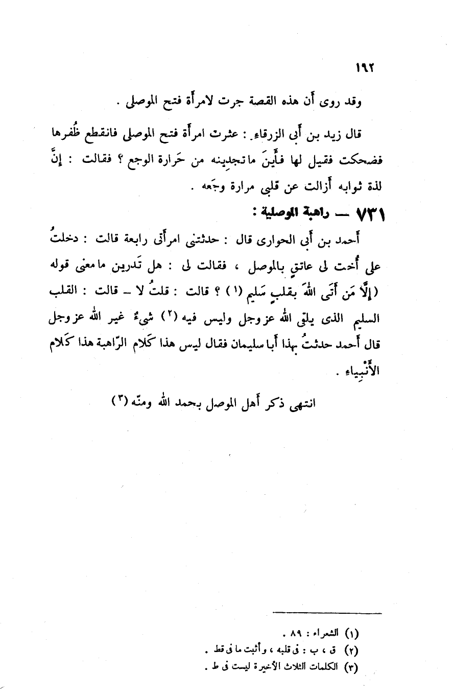 أحمد بن أبي الحواري قال حدثتني امرأتي رابعة قالت دخلت على أخت لي عاتق بالموصل فقالت لي هل تدرين ما معنى قوله إلا من أتى الله بقلب سليم قالت قلت لا قالت القلب السليم الذي يلقى الله عزوجل و ليس فيه شيء غير الله عزوجل قال أحمد حدثت بهذا أبا سليمان فقال ليس هذا كلام الراهبة هذا كلام الأنبياء