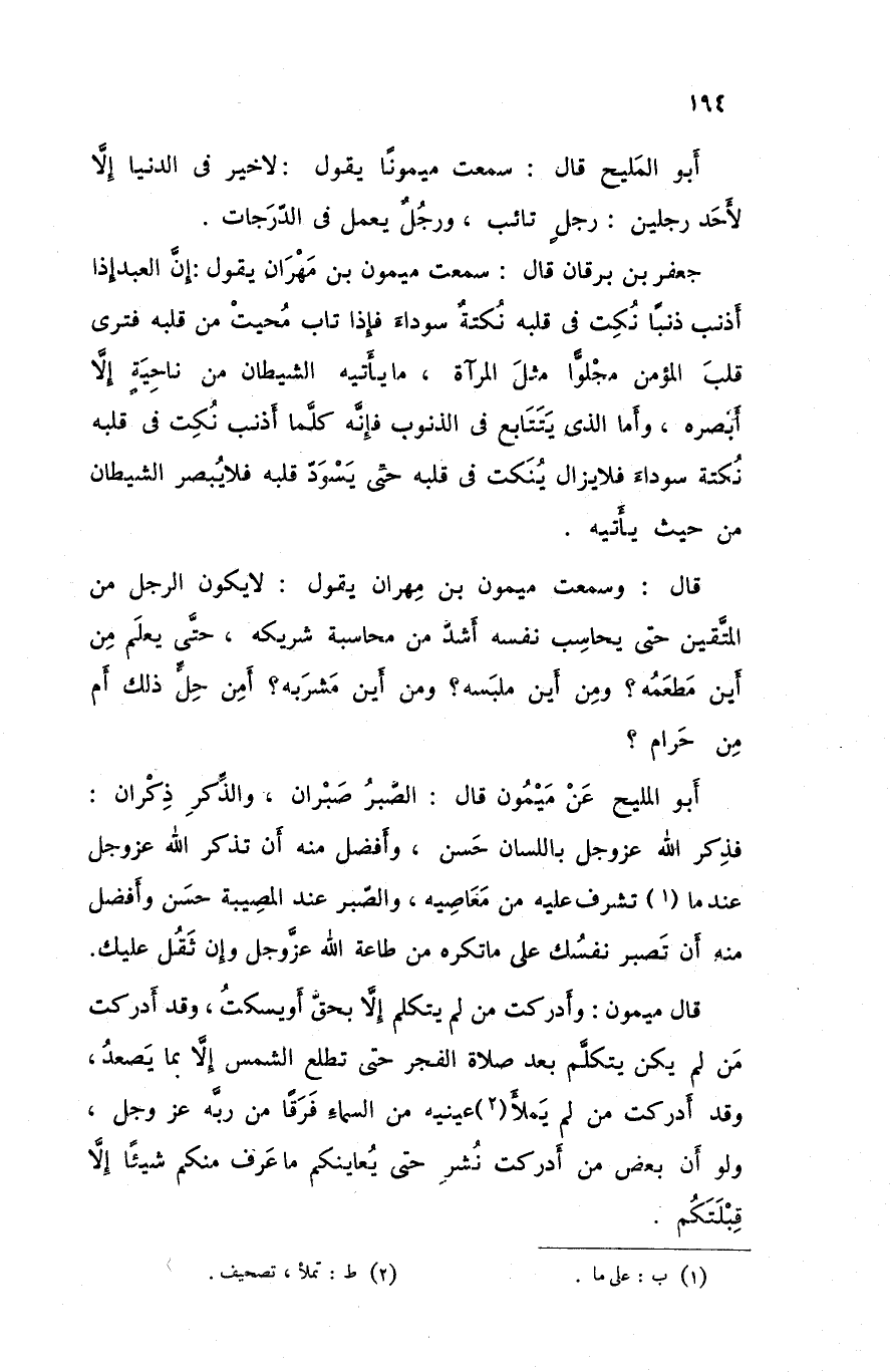 جعفر بن برقان قال سمعت ميمون بن مهران يقول إن العبد إذا أذنب ذنبا نكت في قلبه نكتة سوداء فإذا تاب محيت من قلبه فترى قلب المؤمن مجلوا مثل المرآه ما يأتيه الشيطان من ناحية إلا أبصره وأما الذي يتتابع في الذنوب فإنه كلما أذنب نكت في قلبه نكتة سوداء فلا يزال ينكت في قلبه حتى يسود قلبه فلا يبصر الشيطان من حيث يأتيه