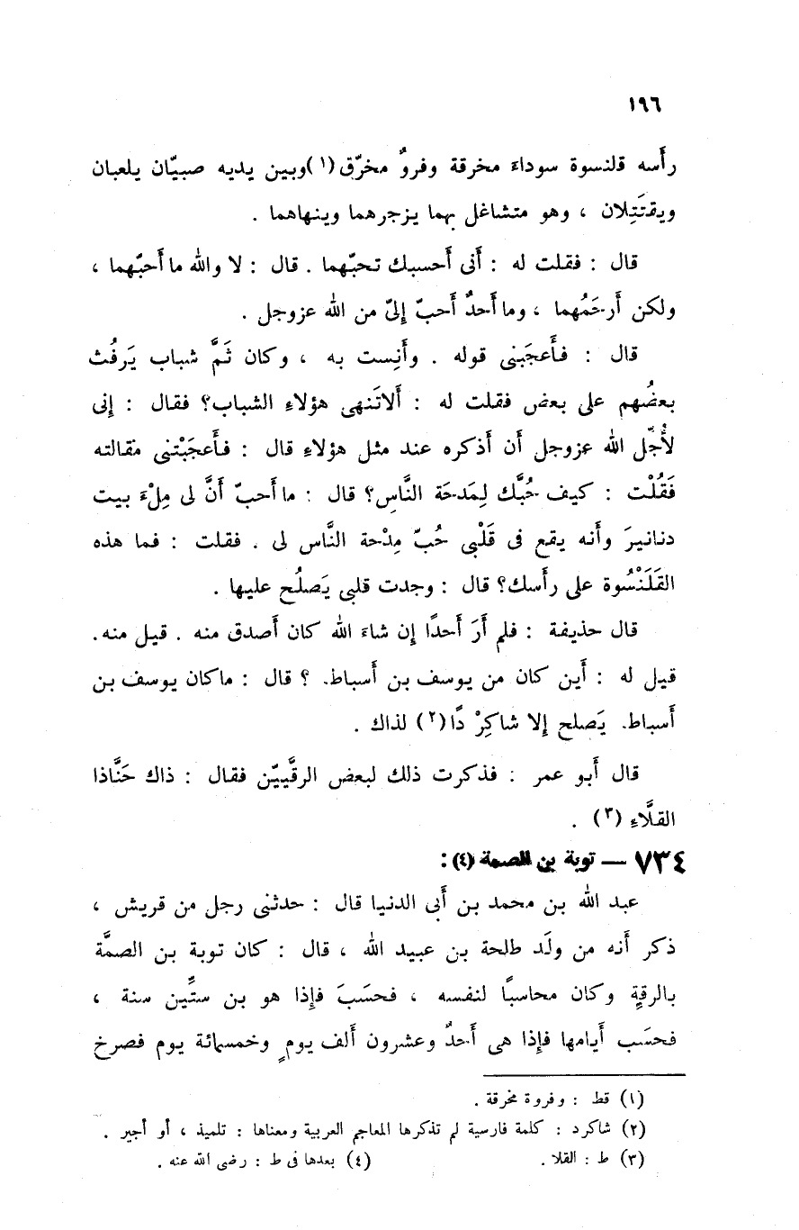 عبد الله بن محمد بن أبي الدنيا قال حدثني رجل من قريش ذكر أنه من ولد طلحة بن عبيد الله قال كان توبة بن الصمة بالرقة و كان محاسبا لنفسه فحسب فإذا هو بن ستين سنة فحسب أيامها فإذا هي أحد و عشرون ألف يوم و خمسمائة يوم فصرخ