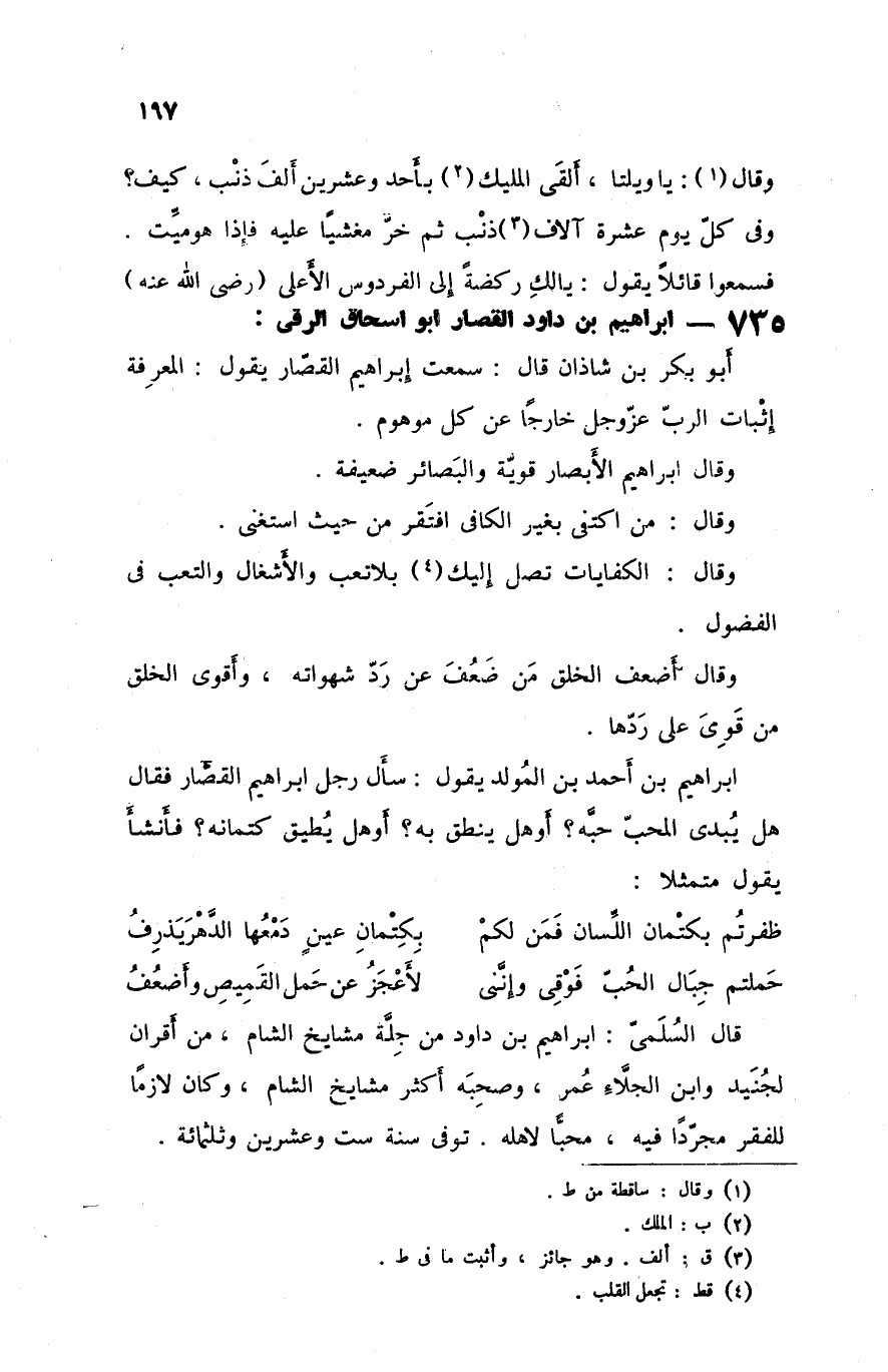 قال السلمي إبراهيم بن داود من جلة مشايخ الشام من أقران لجنيد و ابن الجلاء عمر و صحبه أكثر مشايخ الشام و كان لازما للفقر مجردا فيه محبا لأهله توفي سنة ست وعشرين و ثلثمائة