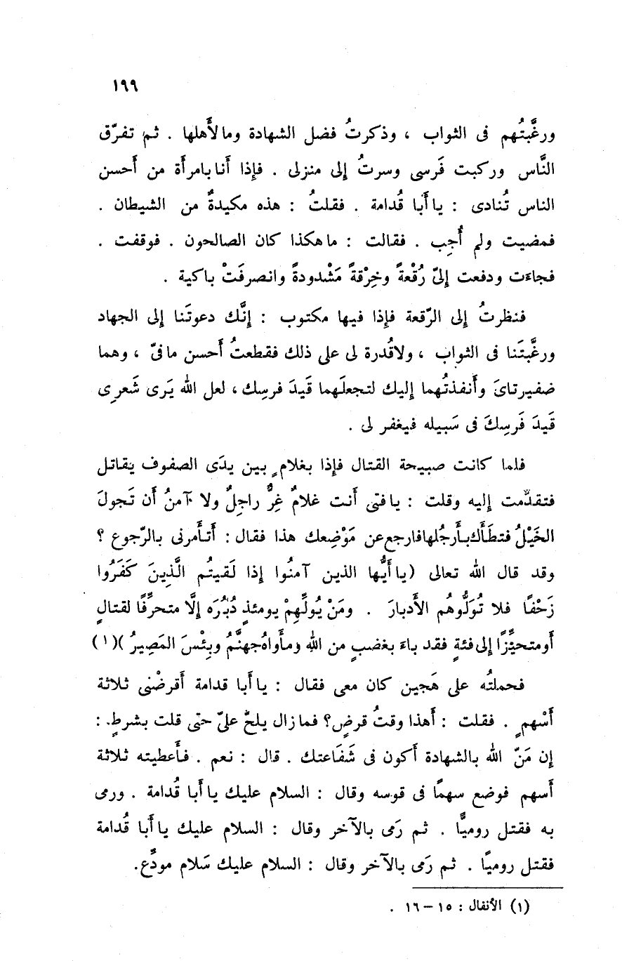 فحملته على هجين كان معي فقال يا أبا قدامة أقرضني ثلاثة أسهم فقلت أهذا وقت قرض فما زال يلح علي حتى قلت بشرط إن من الله بالشهادة أكون في شفاعتك قال نعم فأعطيته ثلاثة أسهم فوضع سهما في قوسه و قال السلام عليك يا أبا قدامة ورمى به فقتل روميا ثم رمى بالآخر و قال السلام عليك يا أبا قدامة فقتل روميا ثم رمى بالآخر وقال السلام عليك سلام مودع