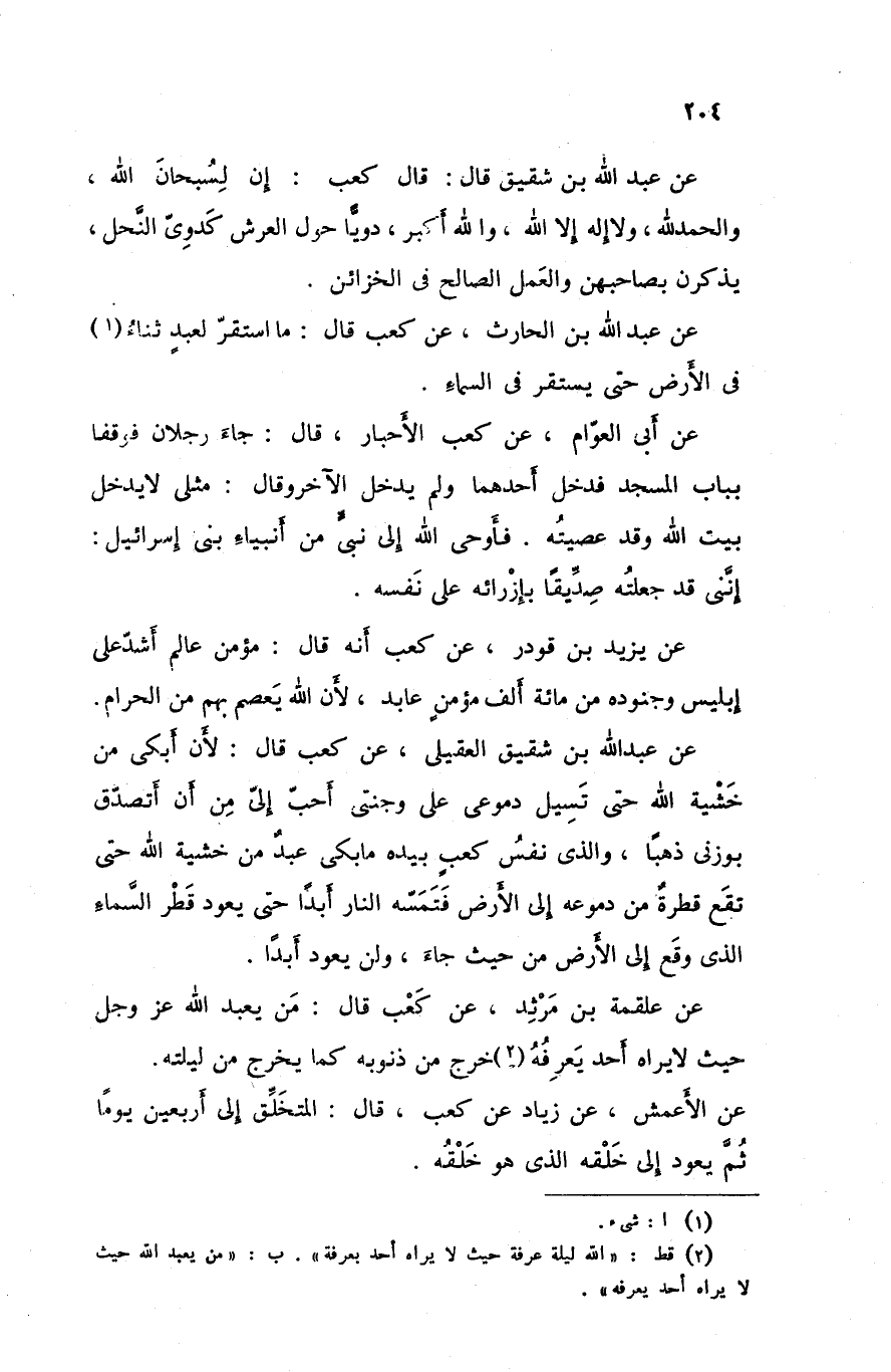 عن عبد الله بن شقيق العقيلي عن كعب قال لأن أبكي من خشية الله حتى تسيل دموعي على وجنتي أحب إلي من أن أتصدق بوزني ذهبا والذي نفس كعب بيده ما بكى عبد من خشية الله حتى تقع قطرة من دموعه إلى الأرض فتمسه النار أبدا حتى يعود قطر السماء الذي وقع إلى الأرض من حيث جاء ولن يعود أبدا