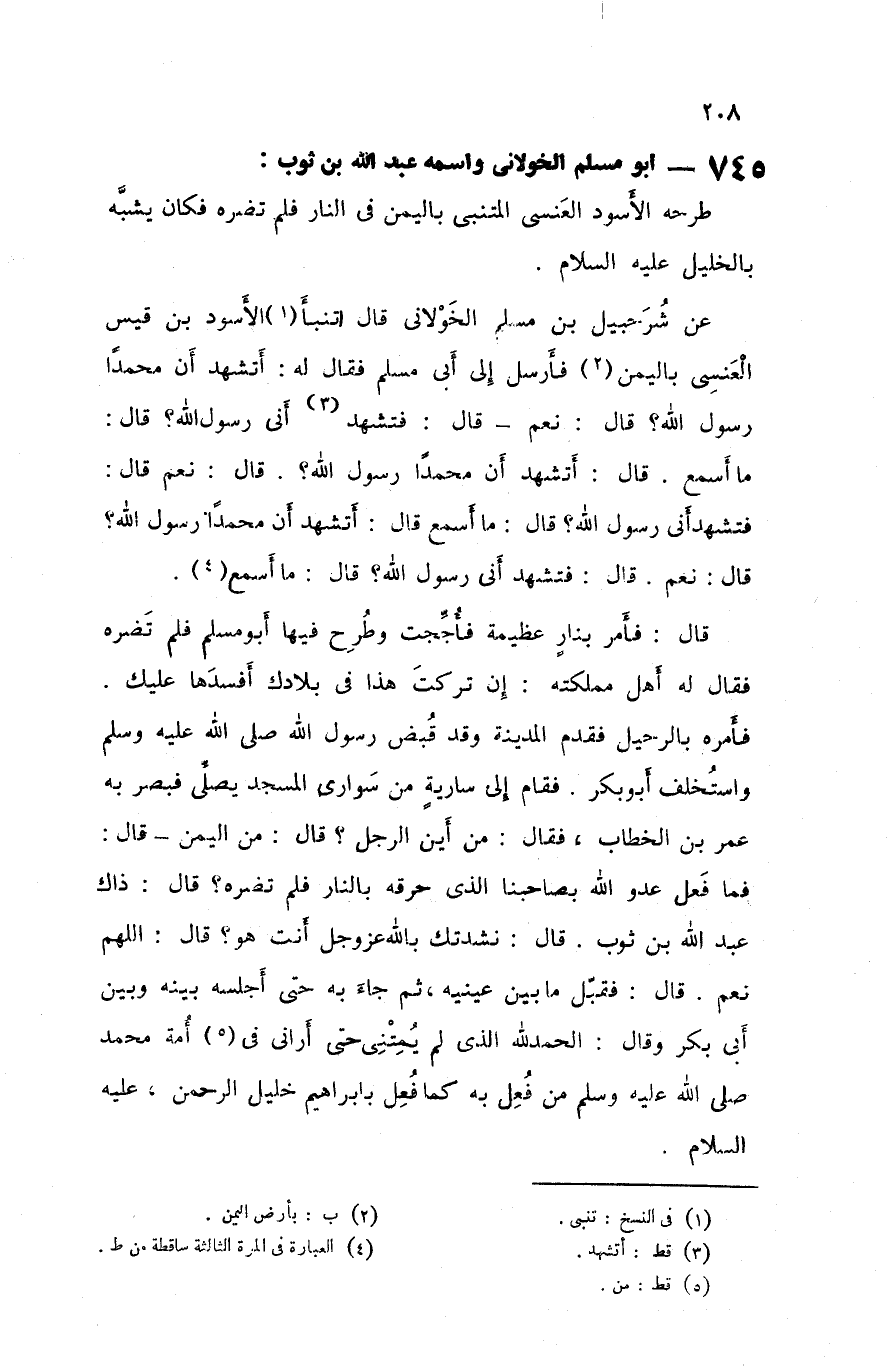 745 - أبو مسلم الخولاني واسمه عبد الله بن ثوب طرحه الأسود العنسي المتنبي باليمن في النار فلم تضره فكان يشبه بالخليل عليه السلام