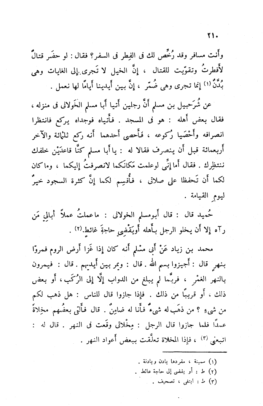 محمد بن زياد عن أبي مسلم أنه كان إذا غزا أرض الروم فمروا بنهر قال أجيزوا بسم الله قال و يمر بين أيديهم قال فيمرون بالنهر الغمر فربما لم يبلغ من الدواب إلا إلى الركب أو بعض ذلك أو قريبا من ذلك فإذا جازوا قال للناس هل ذهب لكم من شيء من ذهب له شيء فأنا له ضامن قال فألقى بعضهم مخلاة عمدا فلما جازوا قال الرجل مخلاتي وقعت في النهر قال له اتبعني فإذا المخلاة تعلقت ببعض أعواد النهر
