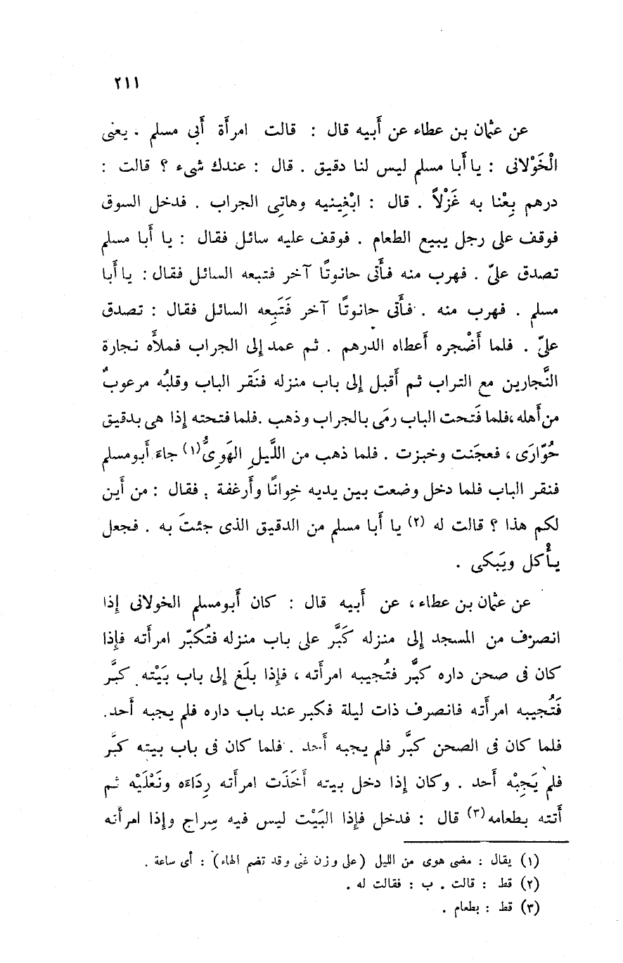 عن عثمان بن عطاء عن أبيه قال قالت امرأة أبي مسلم يعني الخولاني يا أبا مسلم ليس لنا دقيق قال عندك شيء قالت درهم بعنا به غزلا قال ابغينيه وهاتي الجراب فدخل السوق فوقف على رجل يبيع الطعام فوقف عليه سائل فقال يا أبا مسلم تصدق علي فهرب منه فأتى حانوتا آخر فتبعه السائل فقال يا أبا مسلم فهرب منه فأتى حانوتا آخر فتبعه السائل فقال تصدق علي فلما أضجره أعطاه الدرهم ثم عمد إلى الجراب فملأه نجارة النجارين مع التراب ثم أقبل إلى باب منزله فنقر الباب وقلبه مرعوب من أهله فلما فتحت الباب رمى بالجراب وذهب فلما فتحته إذا هي بدقيق حواري فعجنت وخبزت فلما ذهب من الليل الهوي جاء أبو مسلم فنقر الباب فلما دخل وضعت بين يديه خوانا وأرغفة فقال من أين لكم هذا قالت له يا أبا مسلم من الدقيق الذي جئت به فجعل يأكل ويبكي