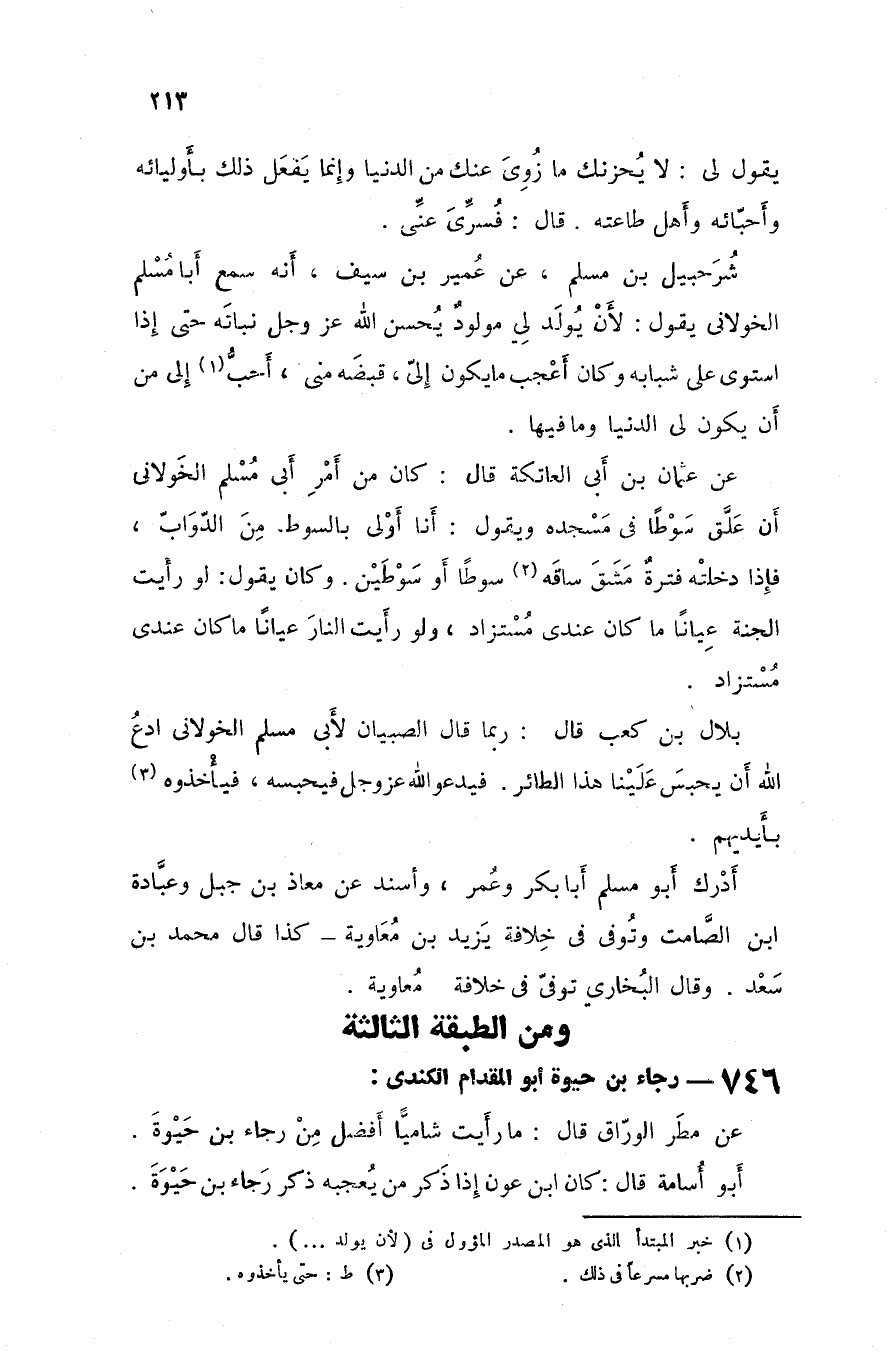 بلال بن كعب قال ربما قال الصبيان لأبي مسلم الخولاني ادع الله أن يحبس علينا هذا الطائر فيدعو الله عزوجل فيحبسه فيأخذوه بأيديهم