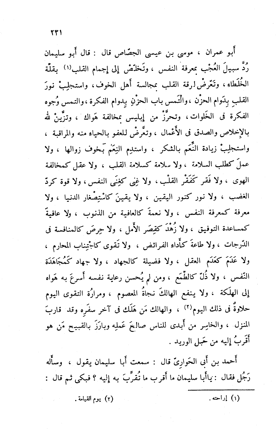 أبو عمران موسى بن عيسى الجصاص قال قال أبو سليمان رد سبيل العجب بمعرفة النفس و تخلص إلى إجمام القلب بقلة الخلطاء وتعرض لرقة القلب بمجالسة أهل الخوف واستجلب نور القلب بدوام الحزن وألتمس باب الحزن بدوام الفكرة وألتمس وجوه الفكرة في الخلوات و تحرز من إبليس بمخالفة هواك و تزين لله بالإخلاص و الصدق في الأعمال و تعرض للعفو بالحياء منه و المراقبة واستجلب زيادة النعم بالشكر واستدم النعم بخوف زوالها ولا عمل كطلب السلامة و لا سلامة كسلامة القلب و لاعقل كمخالفة الهوى ولا فقر كفقر القلب و لا غنى كغنى النفس ولا قوة كرد الغضب ولا نور كنور اليقين ولا يقين كاستصغار الدنيا ولا معرفة كمعرفة النفس و لا نعمة كالعافية من الذنوب و لا عافية كمساعدة التوفيق ولا زهد كقصر الأمل ولا حرص كالمنافسة في الدرجات ولا طاعة كأداء الفرائض ولا تقوى كاجتناب المحارم ولاعدم كعدم العقل ولا فضيلة كالجهاد ولا جهاد كمجاهدة النفس ولا ذل كالطمع ومن لم يحسن رعاية نفسه أسرع به هواه إلى الهلكة ولا ينفع الهالك نجاة المعصوم ومرارة التقوى اليوم حلاوة في ذلك اليوم و الهالك من هلك في آخر سفره وقد قارب المنزل والخاسر من أبدى للناس صالح عمله وبارز بالقبيح من هو أقرب إليه من حبل الوريد