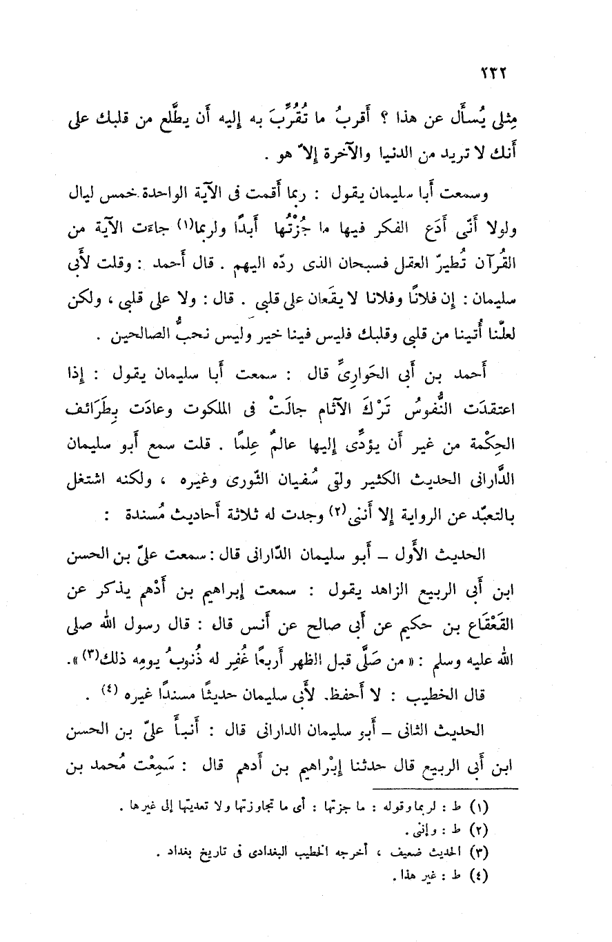 أحمد بن أبي الحواري قال سمعت أبا سليمان يقول إذا اعتقدت النفوس ترك الآثام جالت في الملكوت و عادت بطرائف الحكمة من غير أن يؤدي إليها عالم علما قلت سمع أبو سليمان الداراني الحديث الكثير و لقي سفيان الثوري و غيره ولكنه اشتغل بالتعبد عن الرواية إلاأنني وجدت له ثلاثة أحاديث مسندة