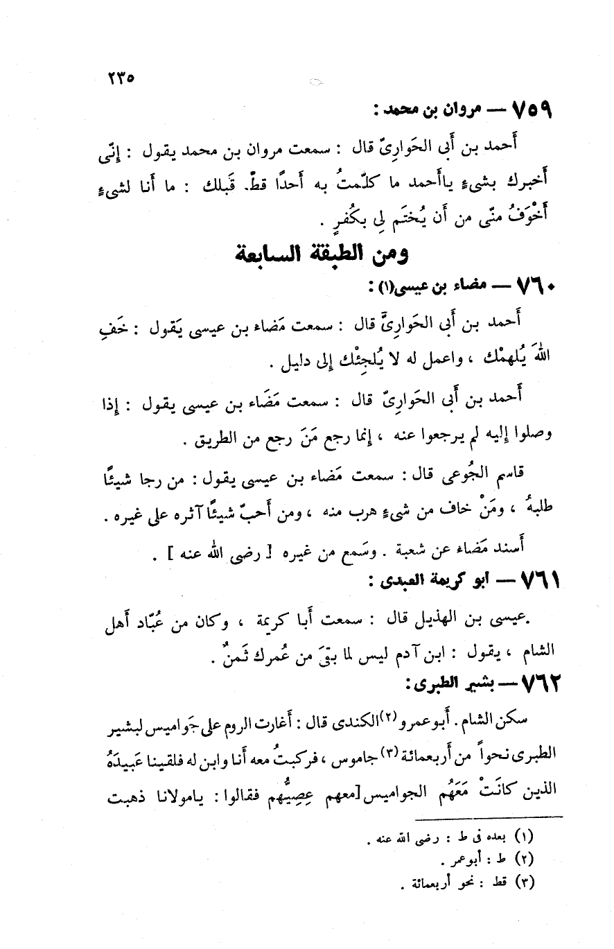 أحمد بن أبي الحواري قال سمعت مروان بن محمد يقول إني أخبرك بشيء يا أحمد ما كلمت به أحدا قط قبلك ما أنا لشيء أخوف مني من أن يختم لي بكفر ومن الطبقة السابعة