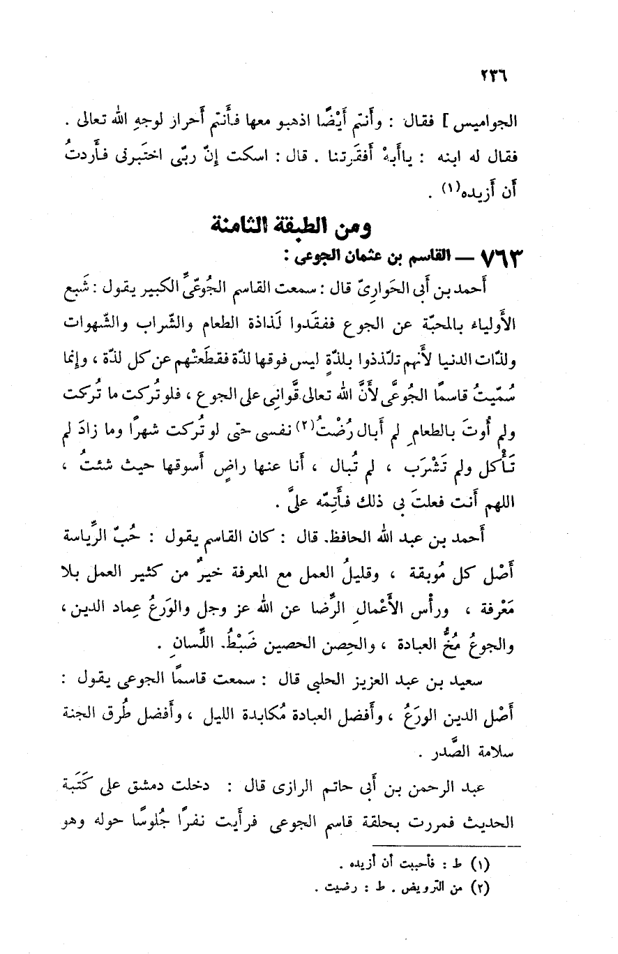 أحمد بن أبي الحواري قال سمعت القاسم الجوعي الكبير يقول شبع الأولياء بالمحبة عن الجوع ففقدموا لذاذة الطعام و الشراب و الشهوات و لذات الدنيا لأنهم تلذذوا بلذة ليس فوقها لذة فقطعتهم عن كل لذة و إنما سميت قاسما الجوعي لأن الله تعالى قواني على الجوع فلو تركت ما تركت و لم أوت بالطعام لم أبال رضت نفسي حتى لو تركت شهرا و ما زاد لم تأكل و لم تشرب لم تبال أنا عنها راض أسوقها حيث شئت اللهم أنت فعلت بي ذلك فأتمه علي