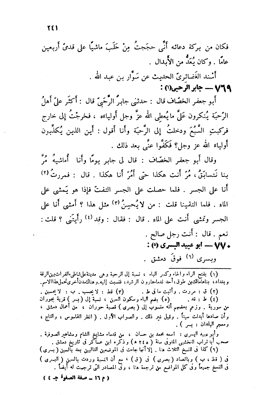 أبو جعفرالخصاف قال حدثني جابر الرحبي قال أكثر علي أهل الرحبة ينكرون علي ما يعطي الله عز و جل أولياءه فخرجت إلى خارج فركبت السبع و دخلت إلى الرحبة و أنا أقول أين الذين يكذبون أولياء الله عزوجل فكفوا عني بعد ذلك